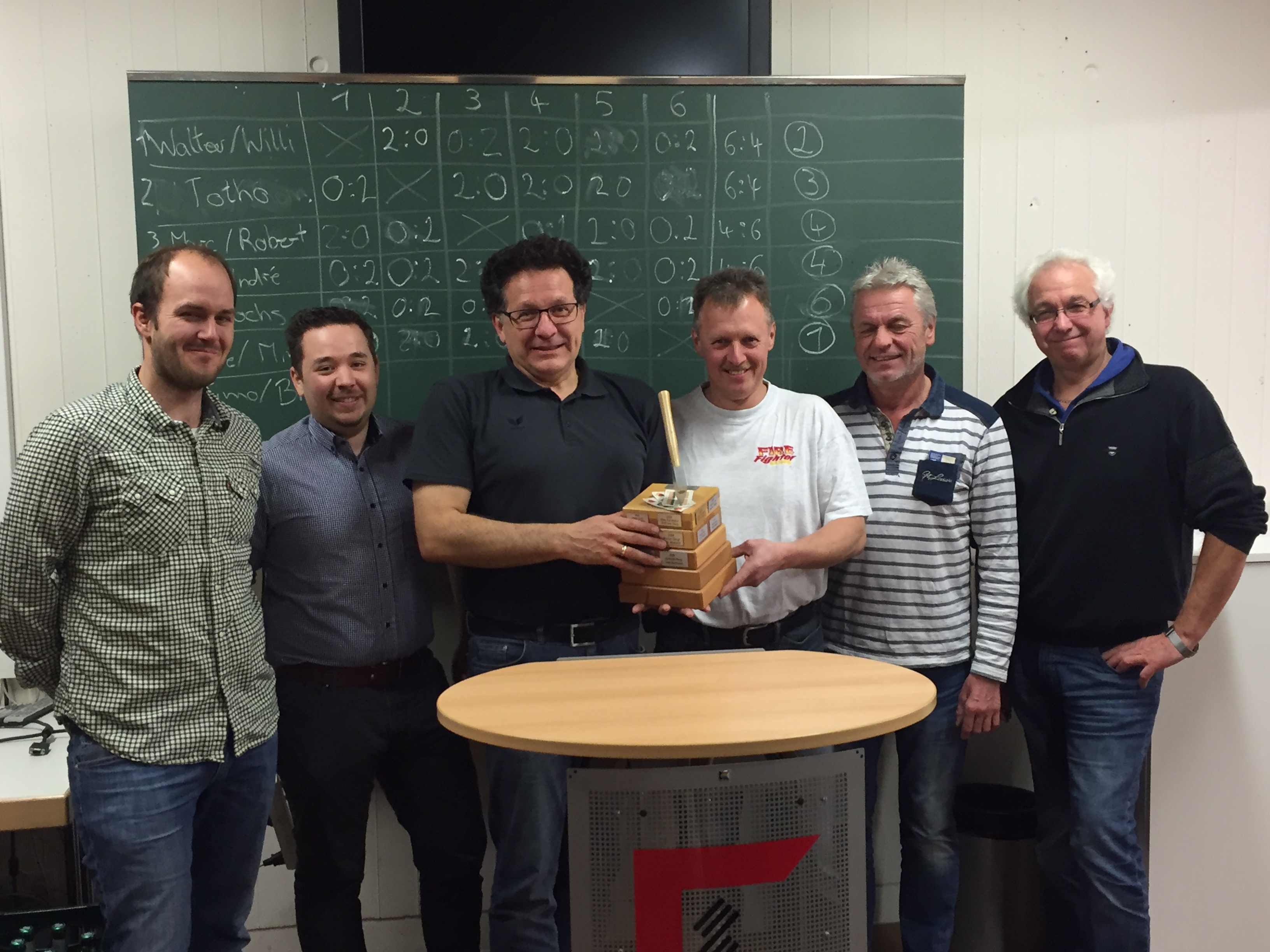 Nachdem im Turnierverlauf “Jeder gegen Jeden” gespielt hatte, kräftig geschmiert, gewunken und gestochen wurde,  stand bereits nach knapp zwei Stunden Spielzeit das Siegerteam fest. Die Seriensieger Andreas Haug und Uwe Hartmann konnten sich dieses Jahr ungeschlagen auf dem Wanderpokal verewigen.