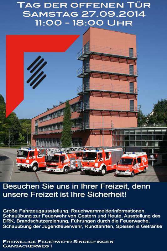 Am 27.09.2014 feiert die Abteilung Sindelfingen von 11:00 bis 18:00 Uhr einen großen Tag der offenen Tür in der Sindelfinger Feuerwache im Gansackerweg 1. Wir präsentieren uns mit einer großen Fahrzeugausstellung, einem Informationsstand zum Thema Rauchwarnmelder, Schauübungen die das Feuerwehrwesen im Lauf der Geschichte demonstrieren, Führungen durch die Feuerwache, eine Schauübung der Jugendfeuerwehr runden das Programm ab. Ebenfalls wird sich das DRK an diesem Tag Ihnen vorstellen. Auch das kulinarische Wohl wird nicht zu kurz kommen. Wir freuen uns Sie an diesem Tag in der Sindelfinger Feuerwache begrüßen zu dürfen.
