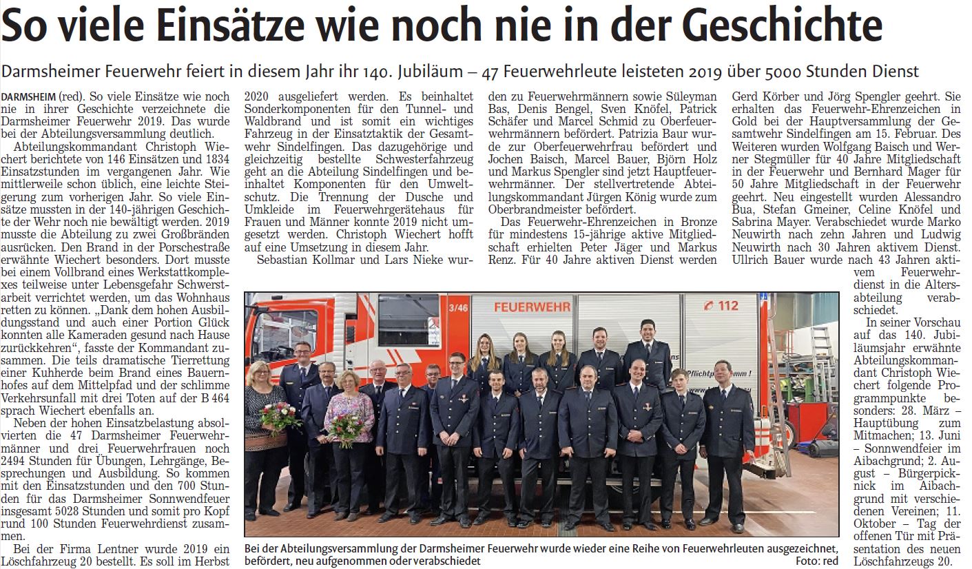Abteilungskommandant Christoph Wiechert berichtet bei der Hauptversammlung der Abteilung Darmsheim für das Jahr 2019 von 146 Einsätzen und 1834 Einsatzstunden. Wie mittlerweile schon üblich, eine leichte Steigerung zum vorherigen Jahr. So viele Einsätze mussten in der 140-jährigen Geschichte der Wehr noch nie bewältigt werden.