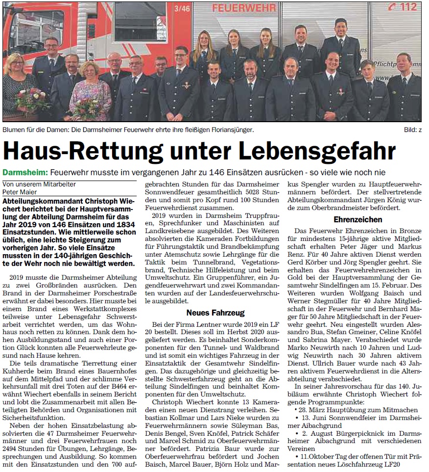2019 musste die Darmsheimer Abteilung zu 2 Großbränden ausrücken. Den Brand in der Darmsheimer Porschestraße erwähnt er dabei besonders. Hier musste bei einem Vollbrand eines Werkstattkomplexes teilweise unter Lebensgefahr Schwerstarbeit verrichtet werden, um das Wohnhaus noch retten zu können. Dank dem hohen Ausbildungsstand und auch einer Portion Glück konnten alle Kameraden gesund nach Hause kehren. Die teils dramatische Tierrettung einer Kuhherde beim Brand eines Bauernhofes auf dem Mittelpfad und der schlimme Verkehrsunfall mit 3 Toten auf der B464 erwähnt Wiechert ebenfalls in seinem Bericht und lobt die Zusammenarbeit mit allen Beteiligten Behörden und Organisationen mit Sicherheitsfunktion.