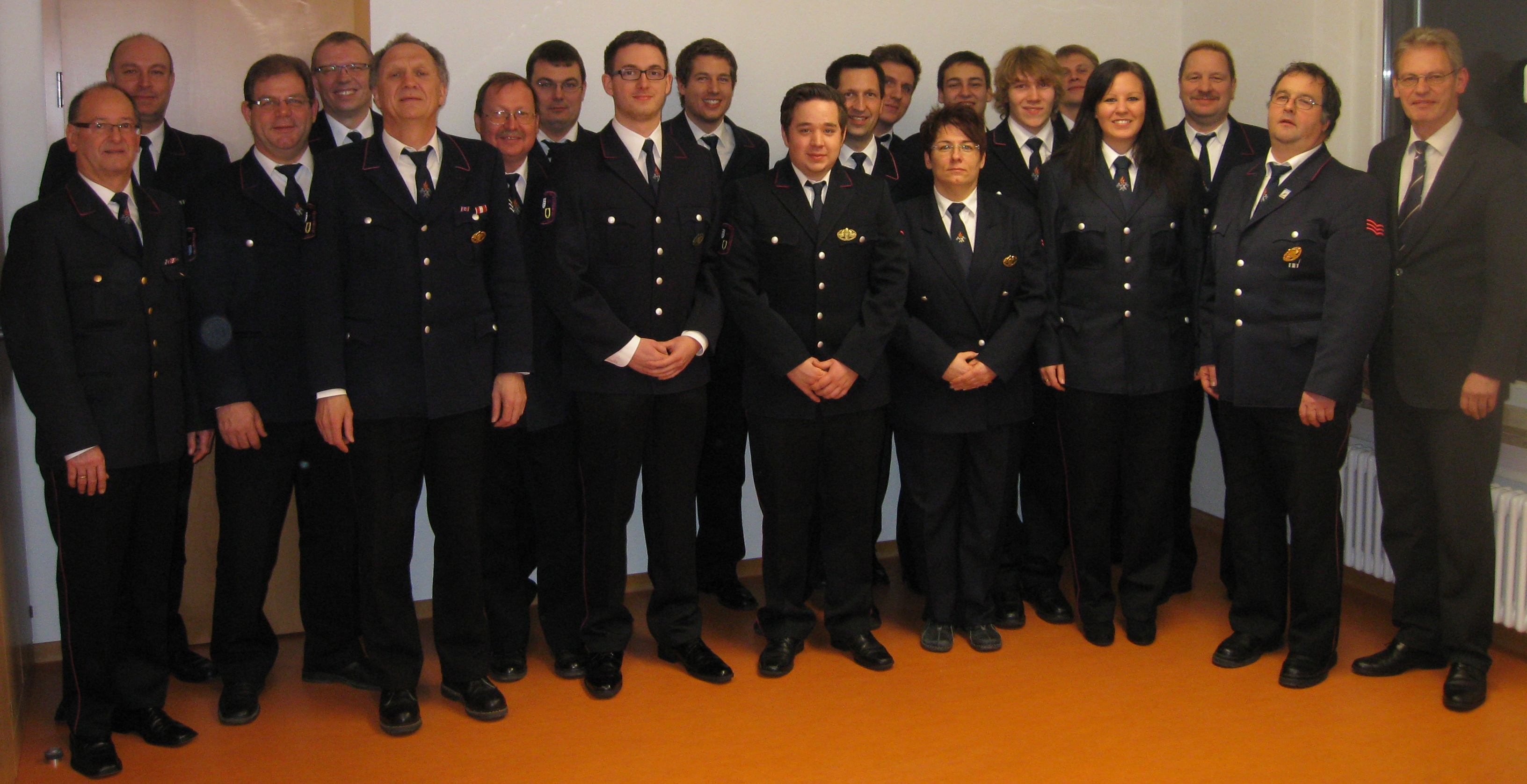 (v.l.n.r.) Stadtbrandmeister Wolfgang Finkbeiner, Sascha Luft, Stv. Stadtbrandmeister Bernd Holz, Oliver Mali, Abteilungskommandant Wolfgang Haug, Joachim Häßner, Sascha Zagola, Denis Jesser, Sascha Henoch, Thomas Schneider, Marco Obermüller, Patrick Schmid, Anke Mooshammer, Nico Haug, André Haug, Robert Wassen, Sandra Widmann, stv. Abteilungskommandant Jürgen Widmann, Markus Winter, Ortsvorsteher Wolfgang Leber
