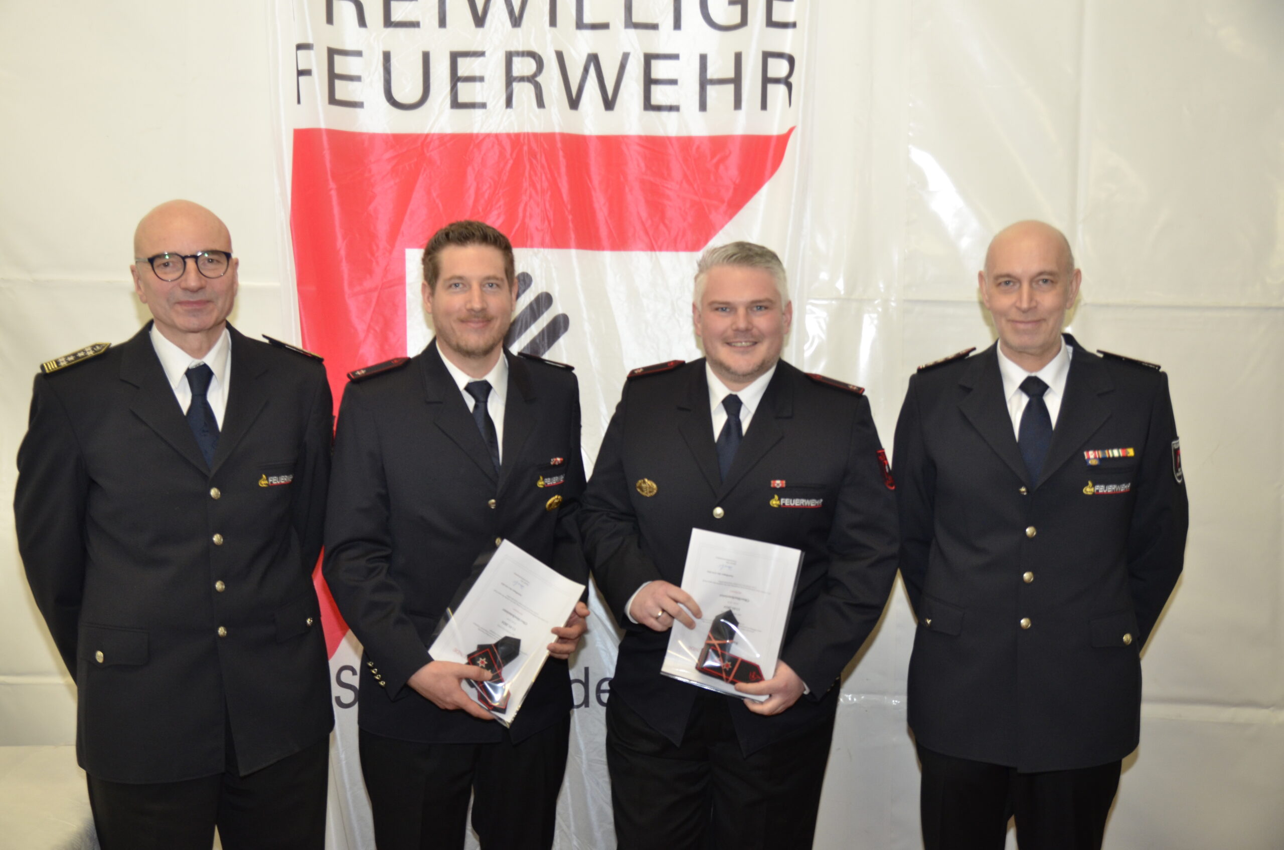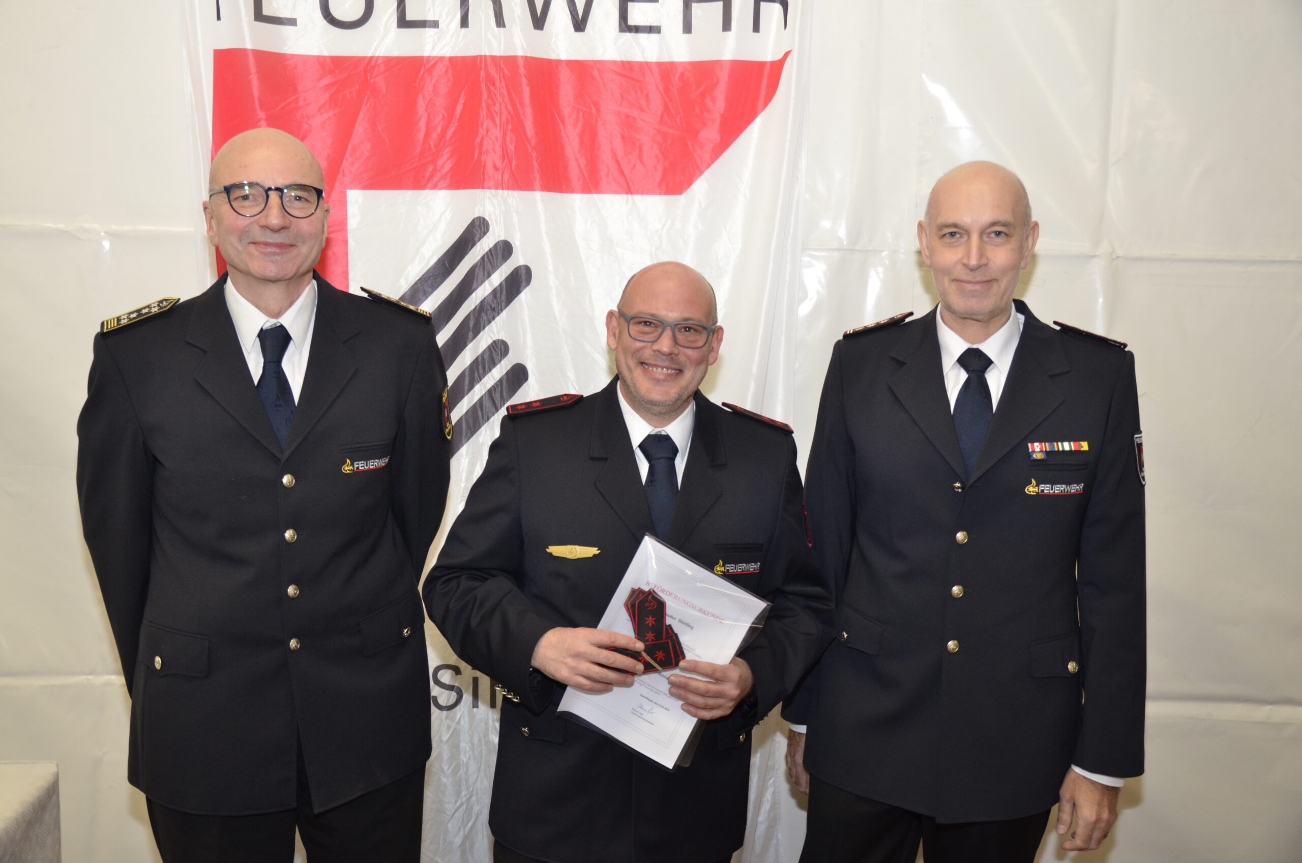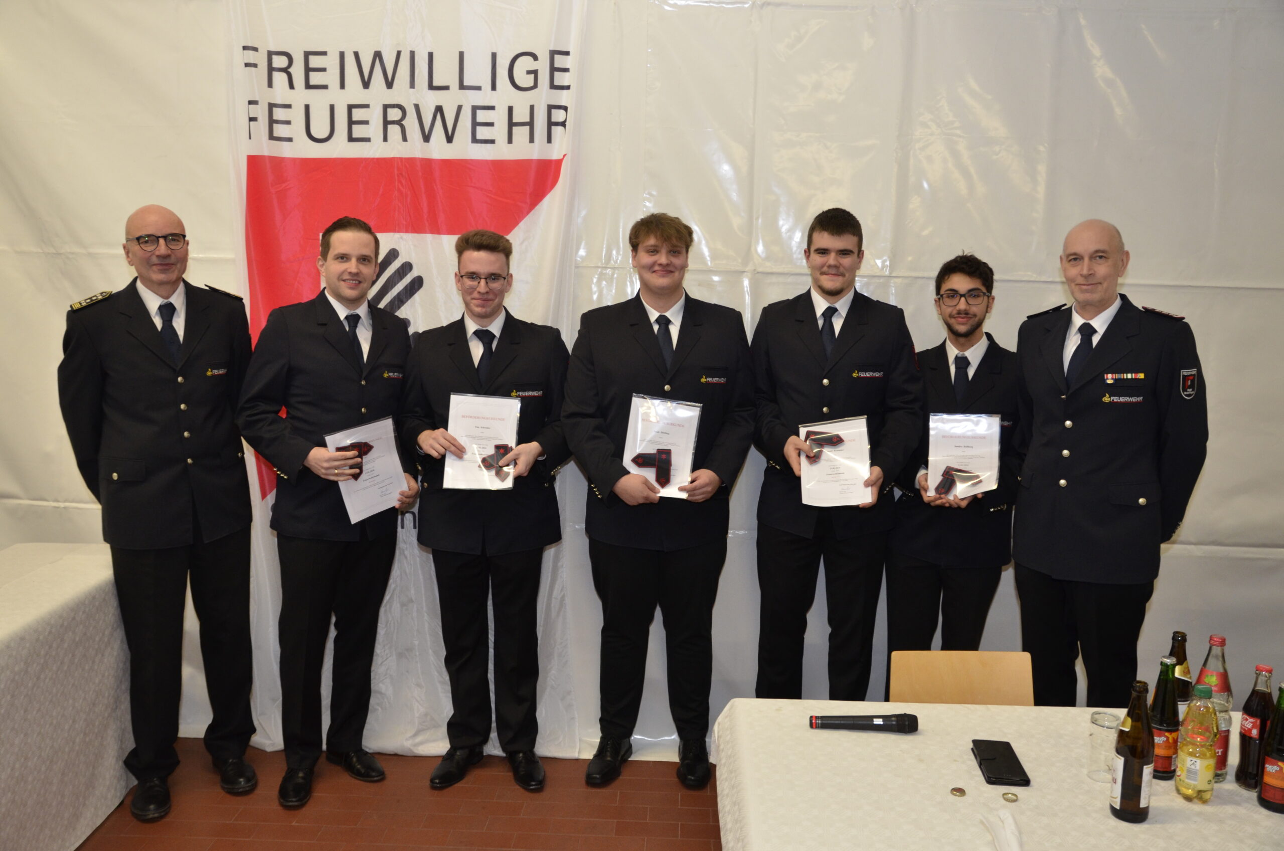 Keine Abteilungsversammlung ohne Beförderungen. Noah Döttling, Samuel Kemmler, Florian Krause, Sandro Rollberg und Tim Schröder wurden nach Beendigung der Probezeit und bestandener Grundausbildung zu Feuerwehrmännern befördert und Alexander Döttling zum Hauptfeuerwehrmann. Nach dem erfolgreichen Abschluss des Gruppenführerlehrgangs wurden Karlheinz Kemmler und Marc Sauermann zu Löschmeistern befördert. Gleichzeitig wurden beide für ein Jahr als Gruppenführer bestellt. Sascha Henoch und Ralf Werchner wurden zu Oberlöschmeistern ernannt. Pascal Sass wurde nach erfolgreichem Abschluss des Zugführerlehrgangs zum Brandmeister befördert und ebenfalls für ein Jahr in dieser Funktion als Zugführer bestellt.
