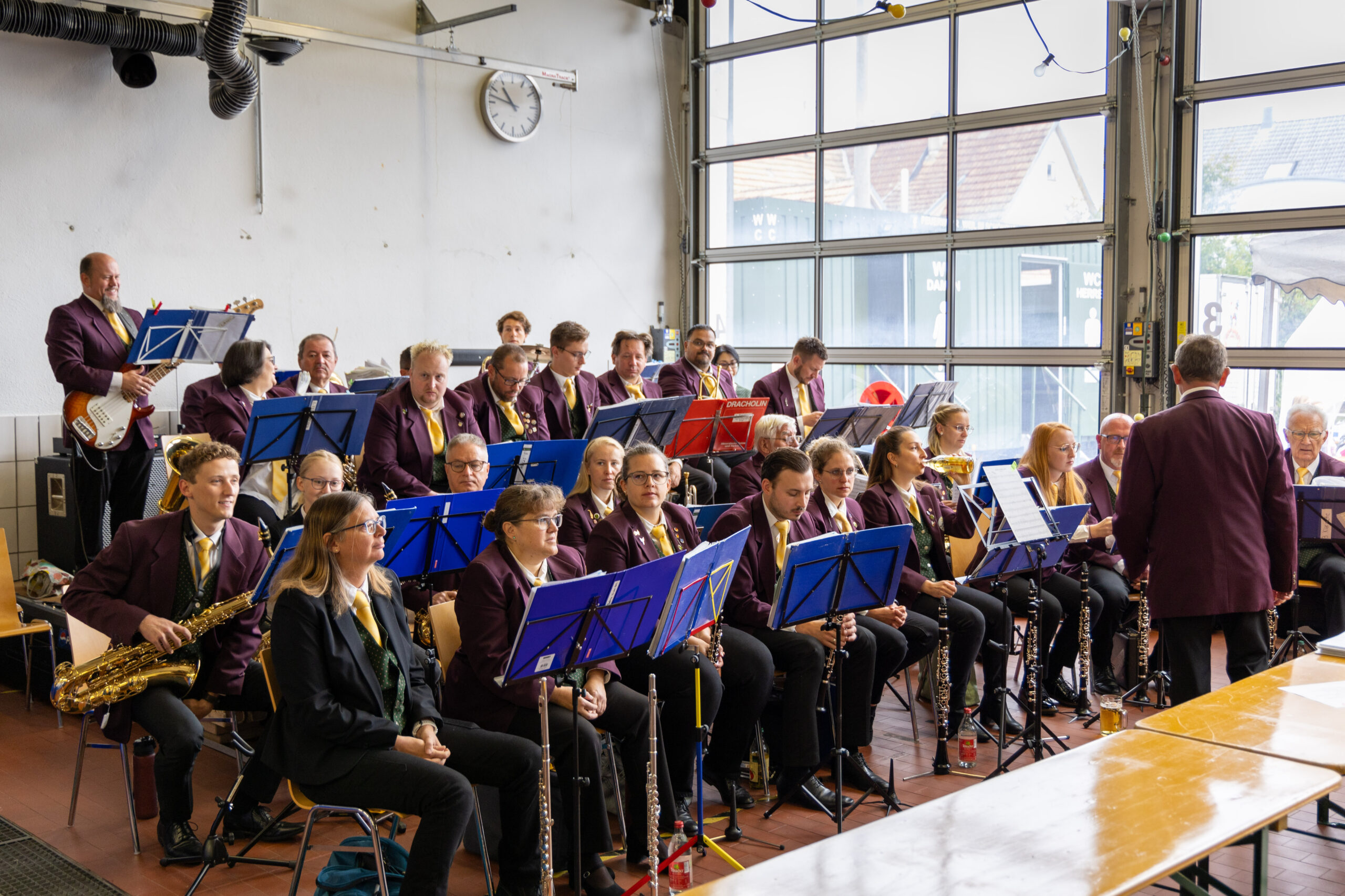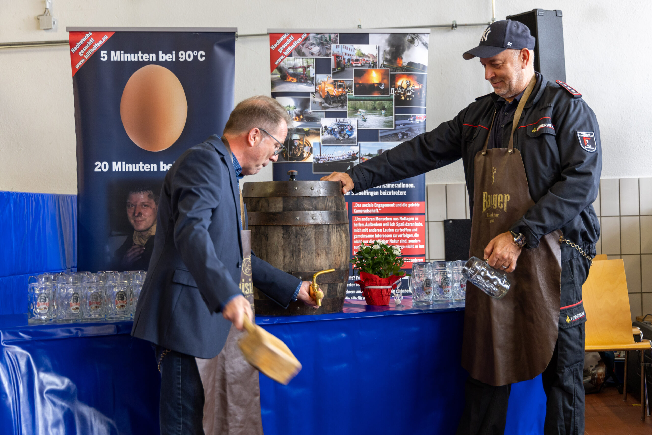 Einen Tag später fand nach fünf Jahren Pause wieder unser Tag der offenen Tür statt. Der Wettergott meinte es sehr gut mit uns, denn pünktlich zur Eröffnung zeigte sich die Sonne und bescherte uns einen sonnigen Spätsommertag. Abteilungskommandant Sascha Luft eröffnete die Veranstaltung und lies Ortsvorsteher Wolfgang Stierle direkt das erste Highlight des Tages absolvieren – den Fassanstich zum Frühshoppen. Dieses Mal benötigte er drei Schläge, 2019 waren es nur zwei. Die Musikkapelle Maichingen begleitete den Auftakt musikalisch und sorgte so bereits vor dem Mittag für tolle Stimmung und ausgelassene Gäste.