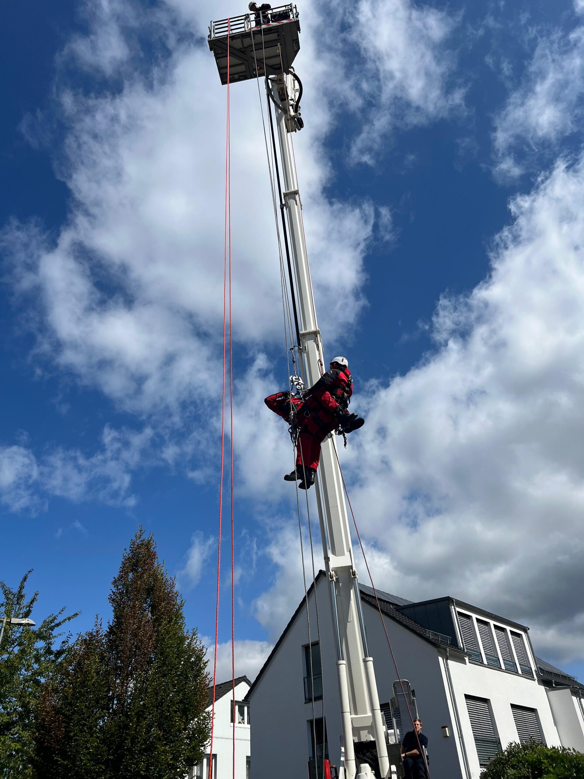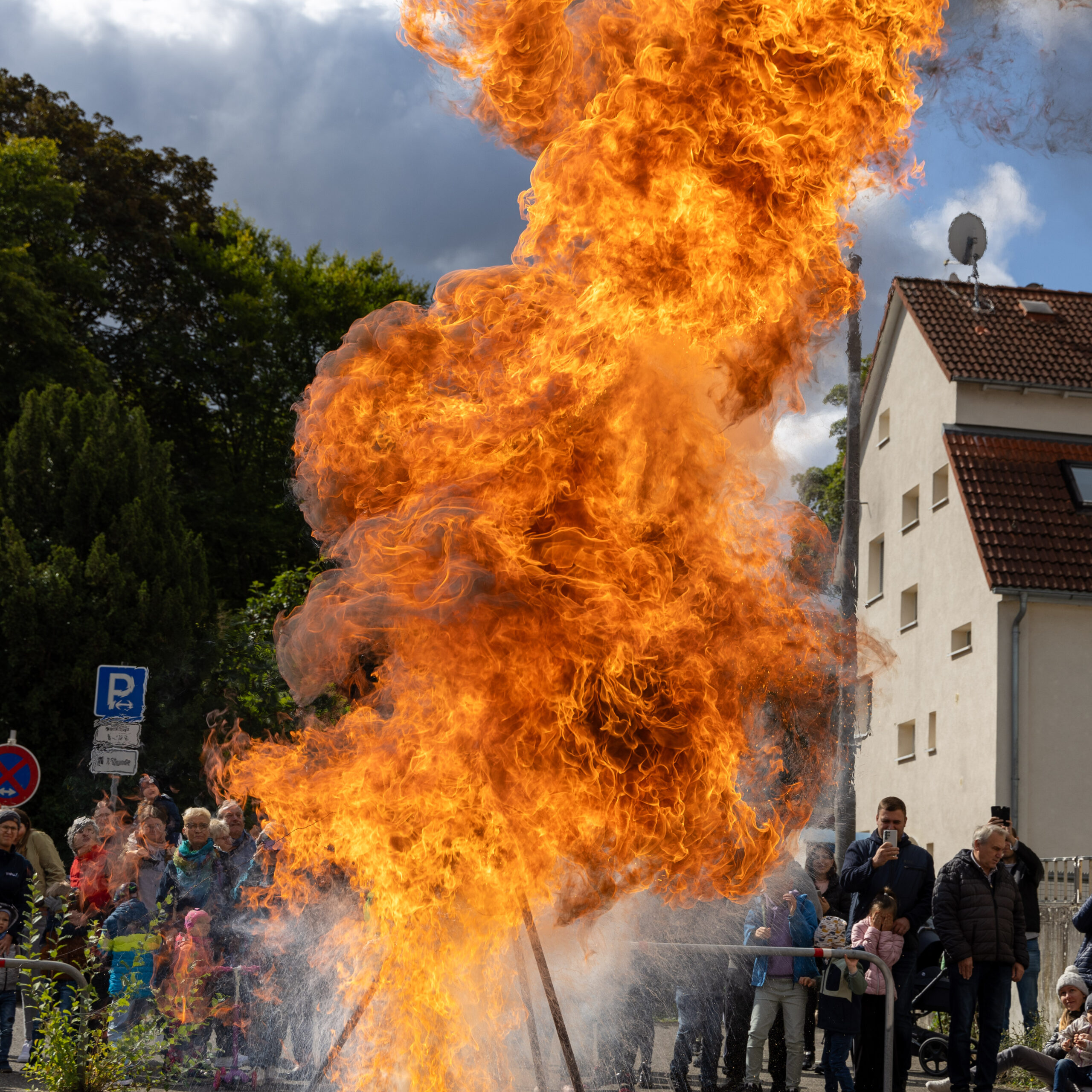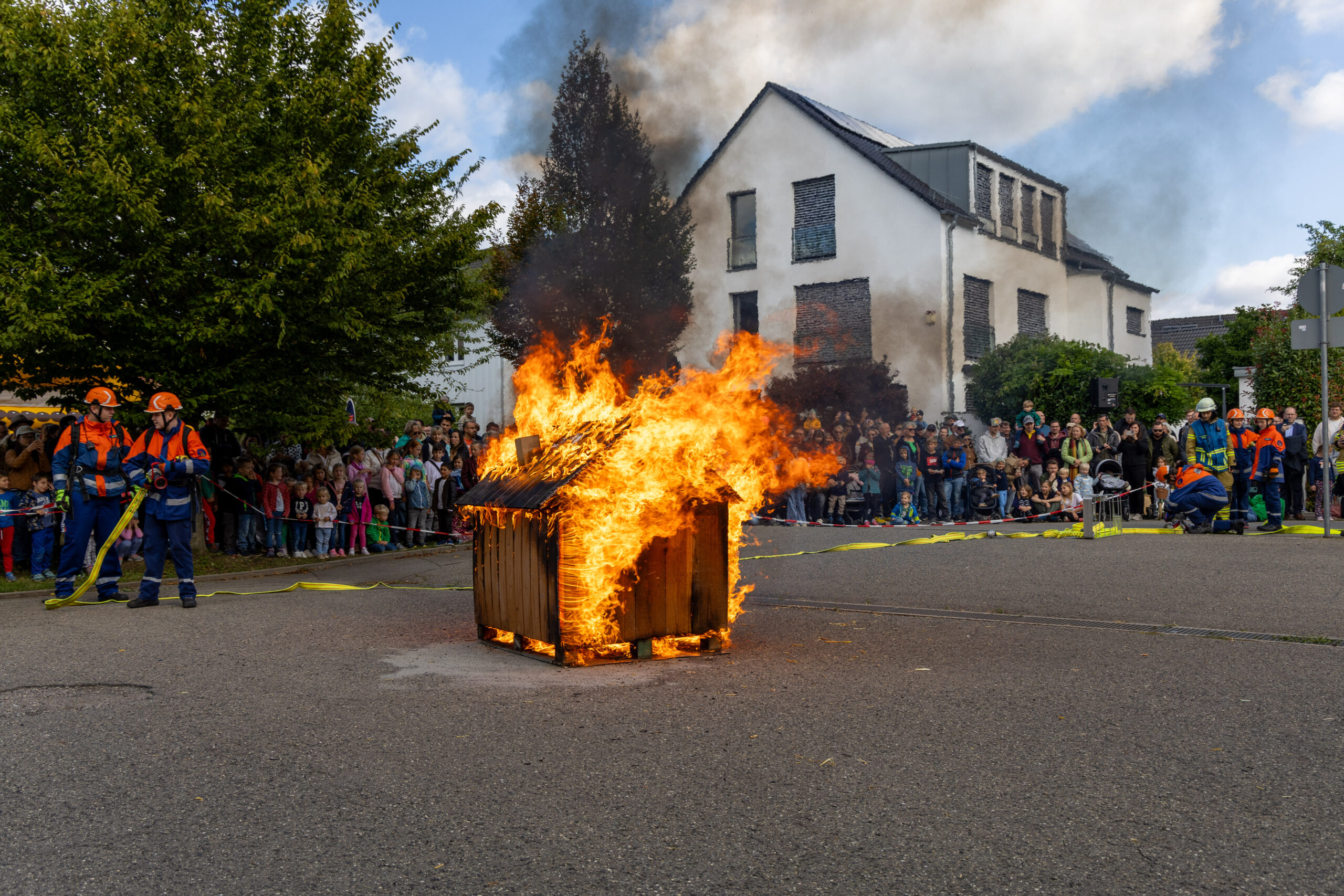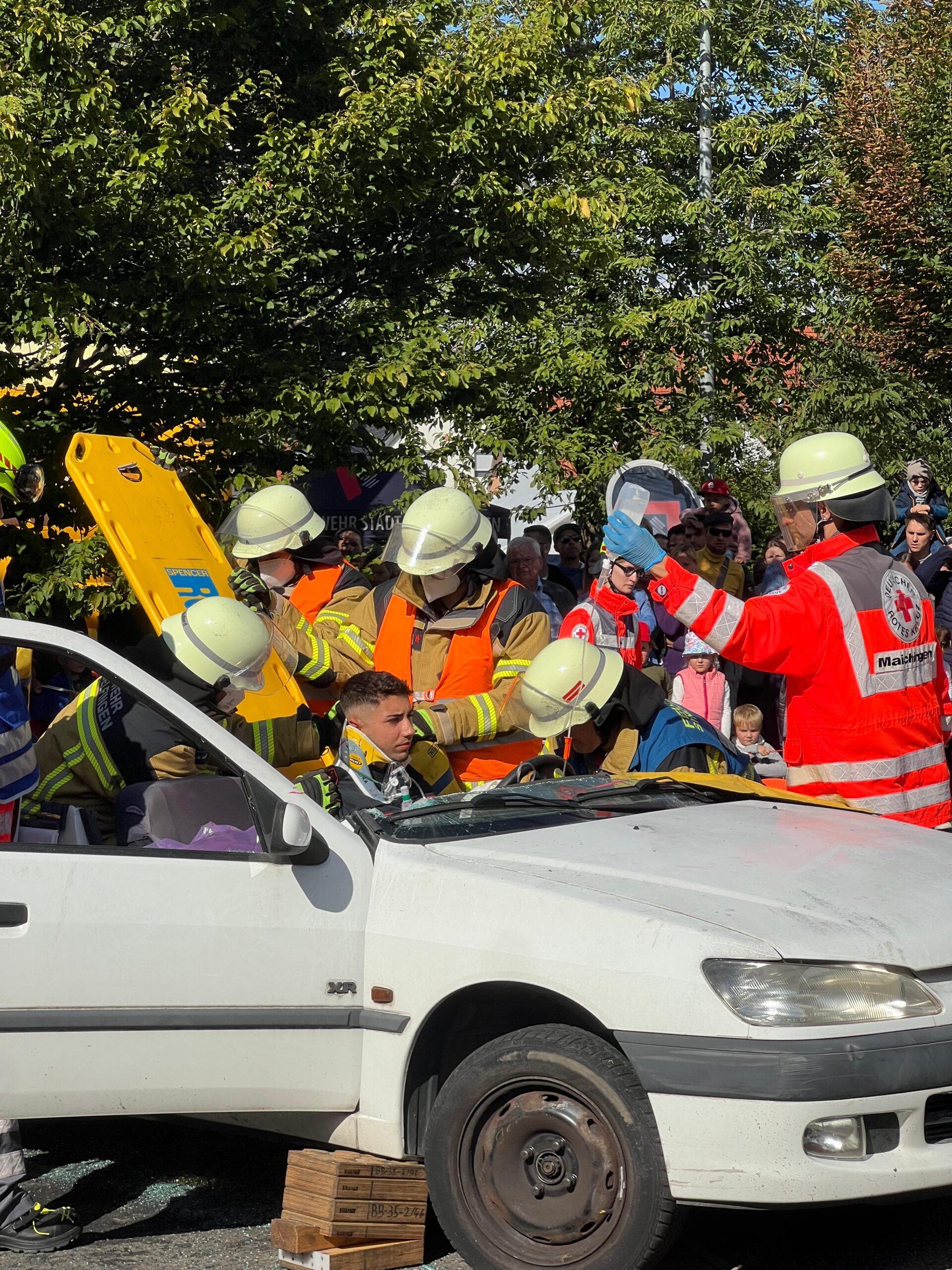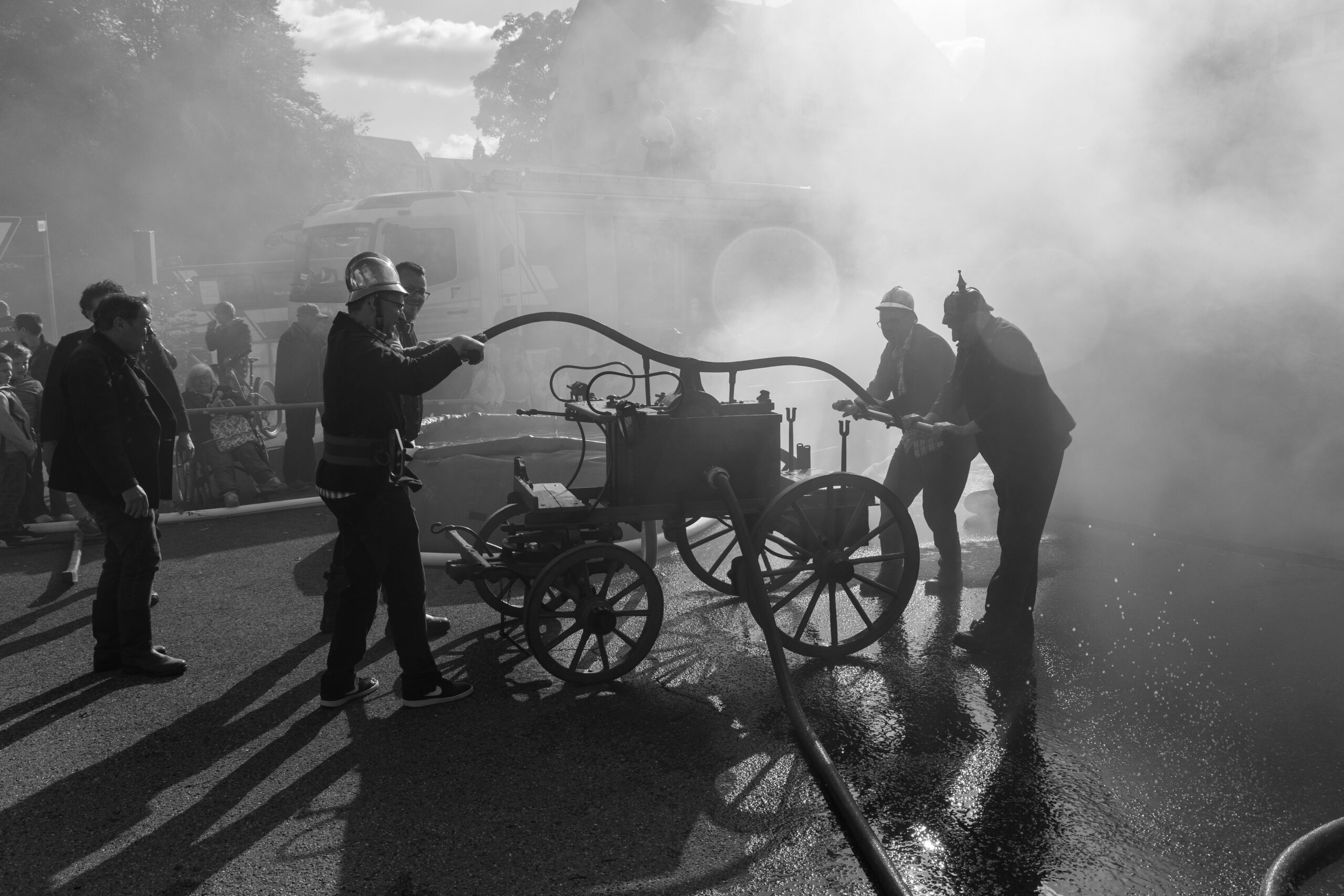 Ab der Mittagszeit konnten sich die Besucherinnen und Besucher in verschiedenen Schauübungen von dem breiten Spektrum der Feuerwehr überzeugen. Eine Fettexplosion, Vorführung der Höhenrettungsgruppe der Werkfeuerwehr Mercedes-Benz, eine Löschübung der Jugendfeuerwehr und eine Übung zur technischen Hilfeleistung nach Verkehrsunfällen der Aktiven gemeinsam mit dem DRK Ortsverein aus Maichingen waren wahre Besuchermagnete. Bei der historischen Schauübung zeigten wir mit unserem alten Hydrophor – eine von Hand gezogene Pumpe auf einem Karren – und in echten historischen Uniformen, wie die Brandbekämpfung vor 100 Jahren aussah.