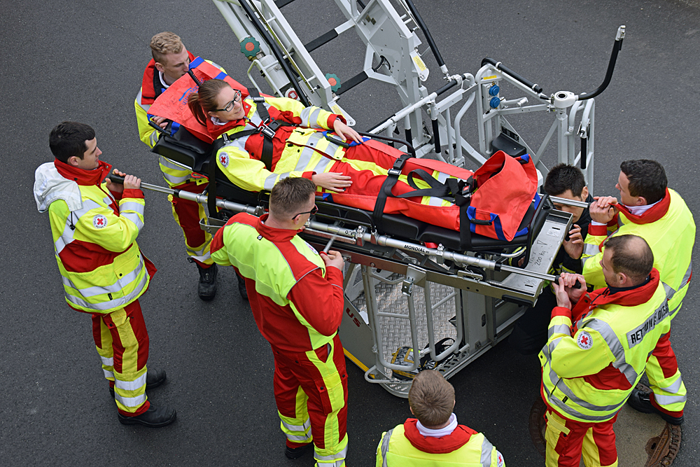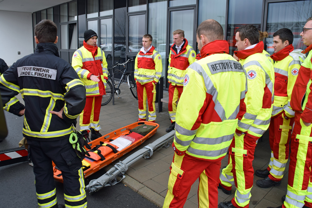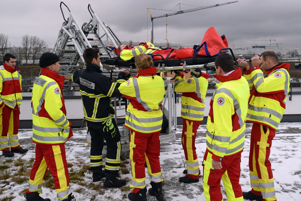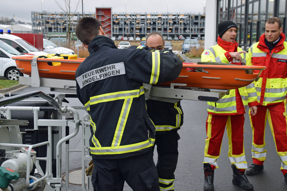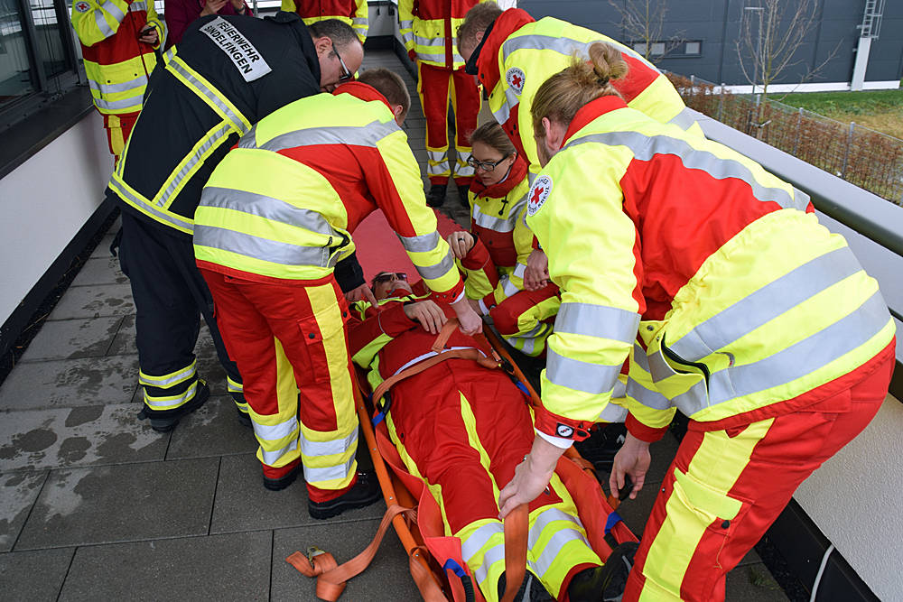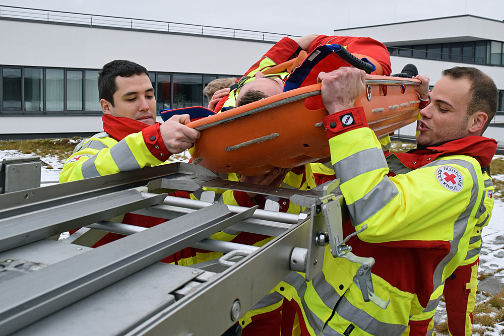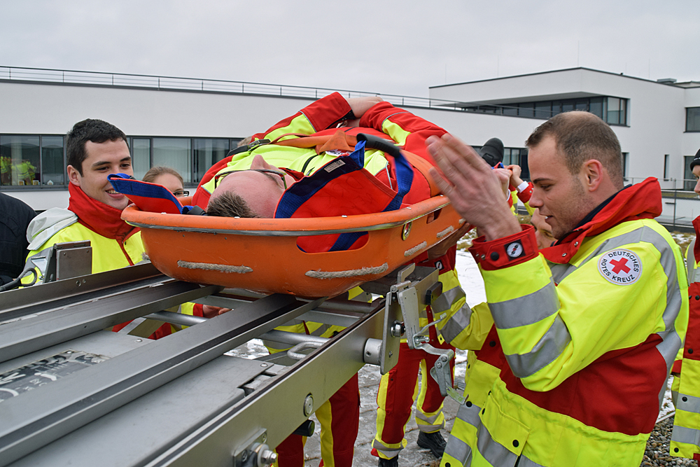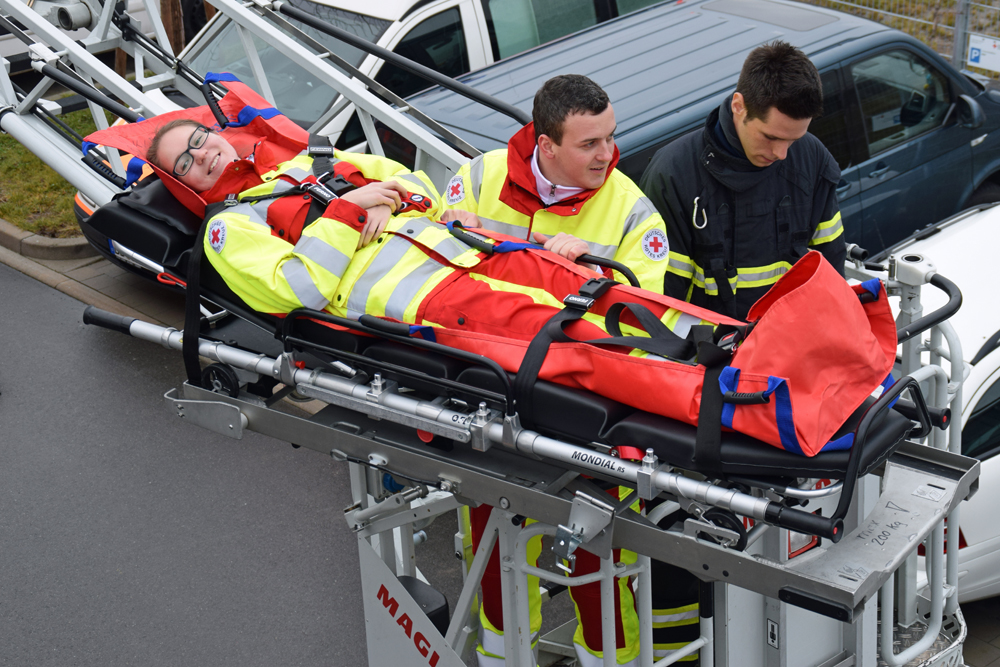 Den Auszubildenden wurden in der Theorie die Rettungsmittel vertraut gemacht. Nachdem die Halterung auf der Drehleiter montiert war, wurde das Aufsetzen der Tragen geübt. Krönender Abschluss war eine Einsatzübung, wo eine Person nach einem Unfall im ersten Obergeschoss nicht mehr geh, fähig war und über eine Trage gerettet werden musste. Die Rettung über das enge Treppenhaus, war nicht möglich, so wurde die Drehleiter eingesetzt. Nachdem die Auszubildenden die richtige Trage ausgewählt hatten, wurde die Person auf das Rettungsmittel gelegt und durch ein Fenster auf die Halterung des Drehleiterkorbes befestigt. Nach fachgerechter Sicherung ging es mit der Person nach unten, sodass sie ebenerdig dem Personal des Rettungsdienstes übergeben werden konnte.