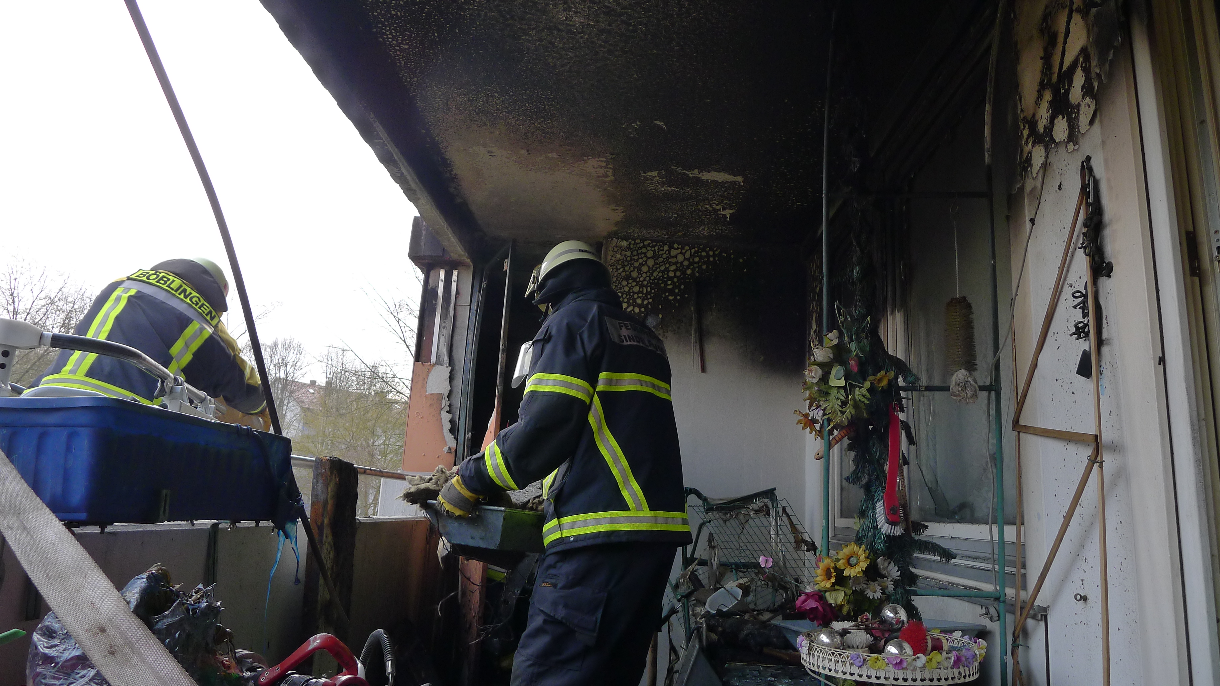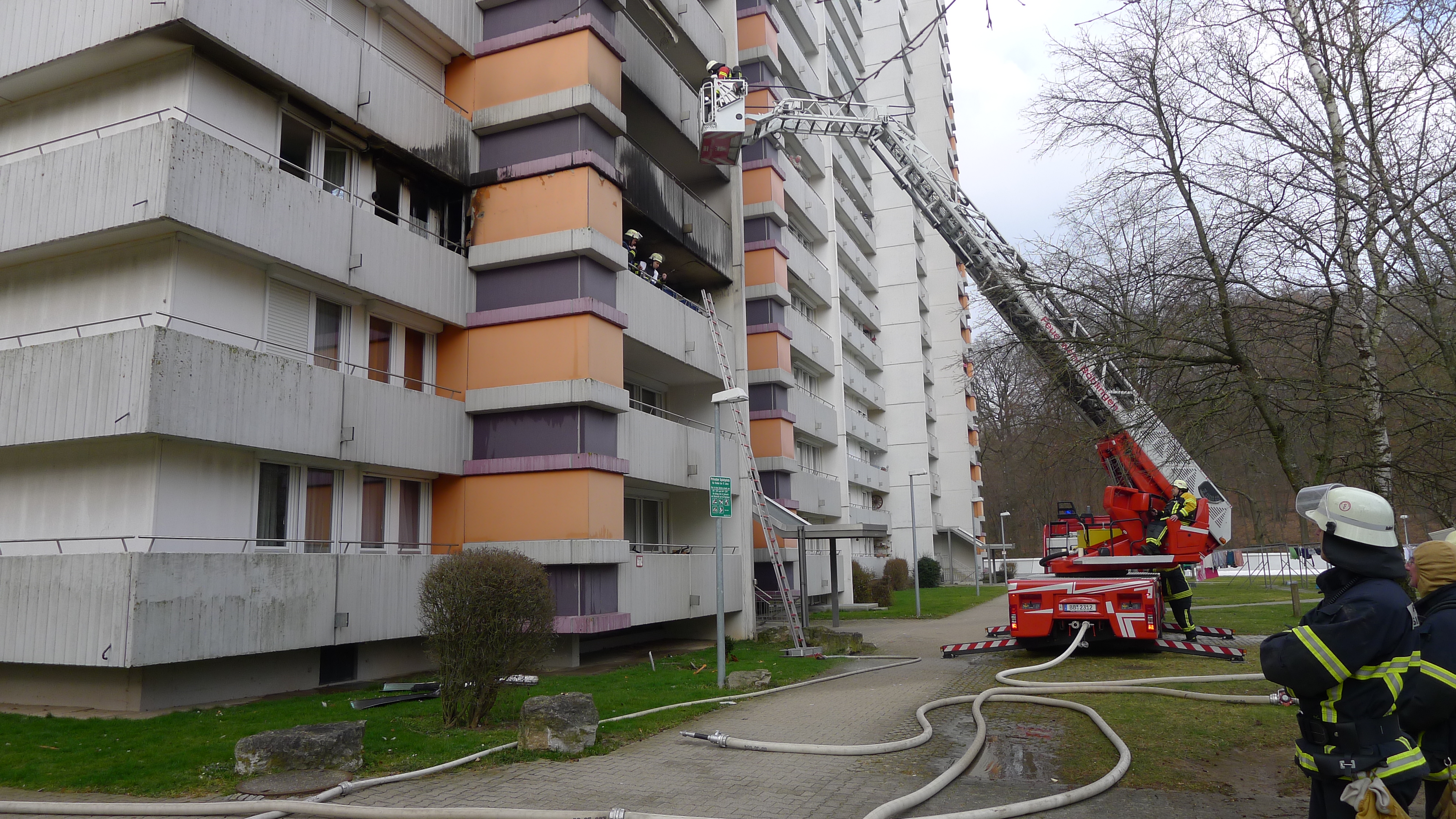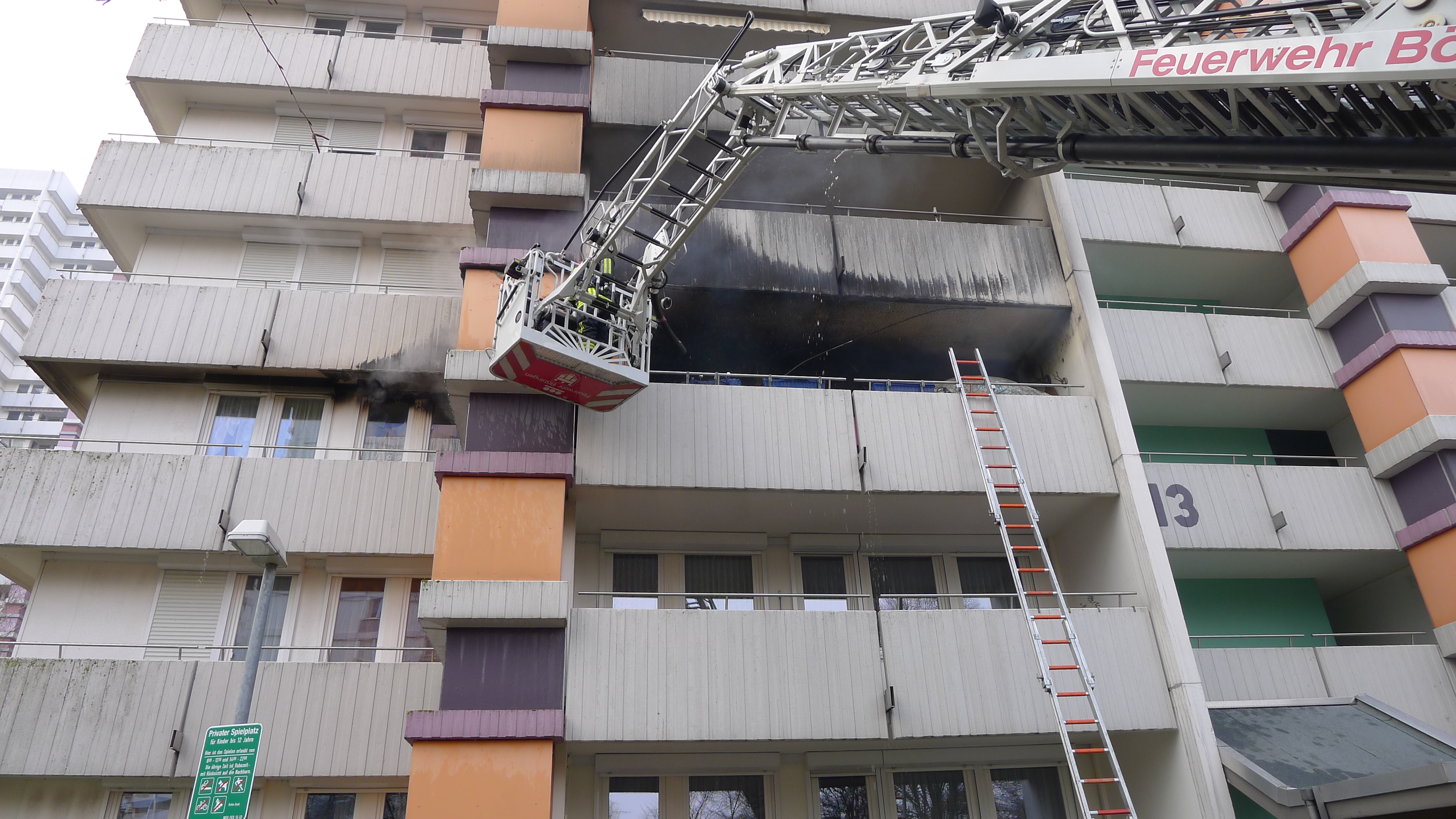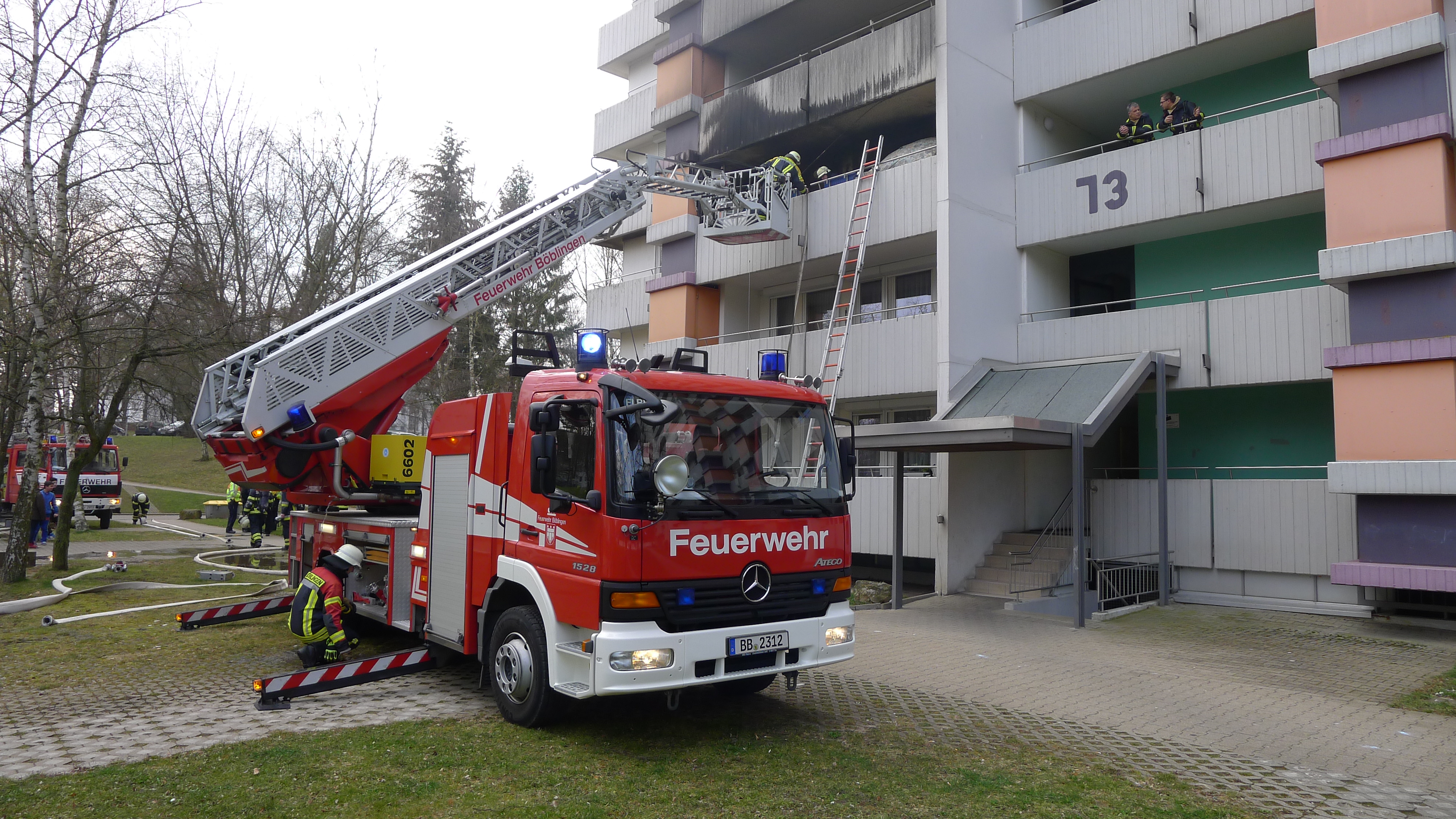 Die Feuerwehr Sindelfingen wurde heute um 14:03 Uhr durch die integrierte Leitstelle Böblingen zu einem Brand in einem Hochhaus in der Friedrich-Ebert Straße in Sindelfingen alarmiert. Gemeldet wurde durch mehrere Notrufe eine Rauchentwicklung aus einer Wohnung im 2. OG mit 2 vermissten Personen. Vor Ort stellte sich der Brand eines Balkons mit der Gefahr des Überschlages der Flammen auf das 3. OG dar. Daraufhin wurde die Alarmstufe erhöht und weitere Feuerwehrkräfte alarmiert. Umgehend wurden die Flammen vom Boden und von der Böblinger Drehleiter von außen bekämpft. Parallel wurde die Menschenrettung über das Treppenhaus vorgenommen. Die Bewohner wurden bei den Nachbarn gefunden und mit einer leichten Rauchgasvergiftung dem Rettungsdienst übergeben. Das Feuer konnte in letzter Sekunde gelöscht werden bevor die Scheiben vollends geplatzt sind, denn die erste Schicht der Doppelverglasung war bereits geplatzt. Nach Belüftung und Kontrolle der Brandstelle mittels Wärmebildkamera konnte die Wohnung wieder freigegeben werden.