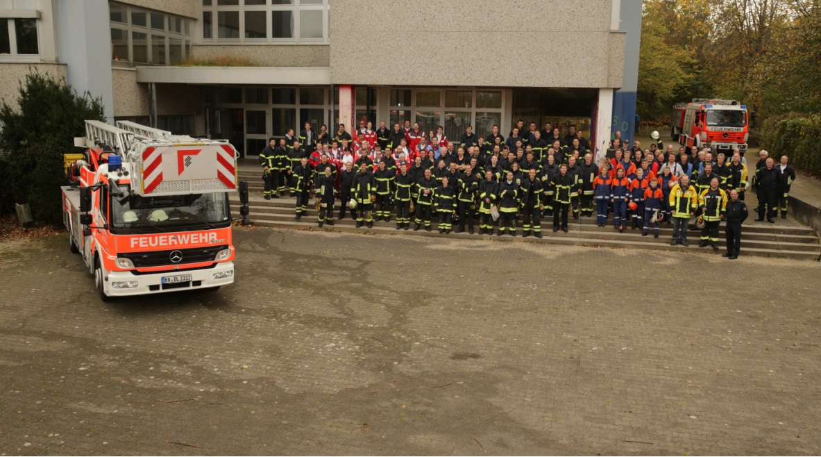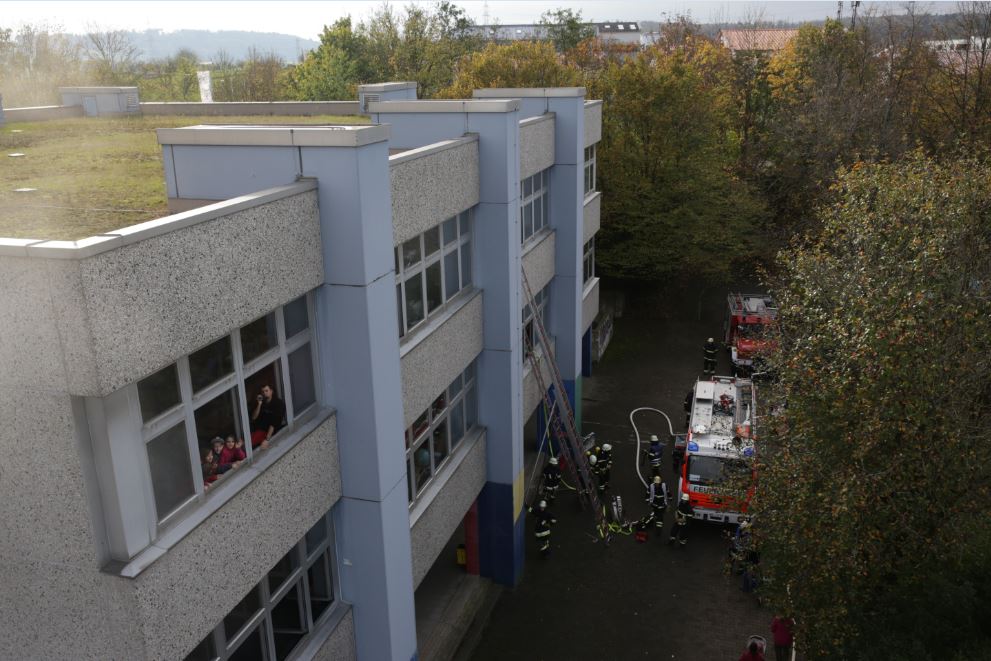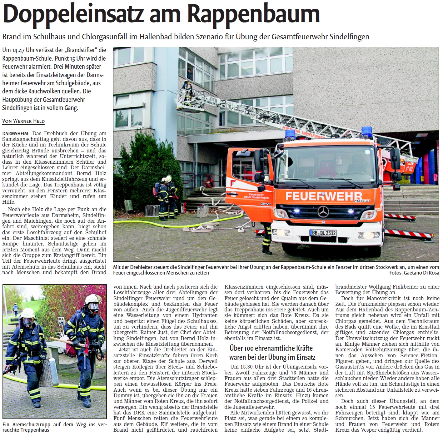 Beteiligte Abteilungen: Abteilung Darmsheim, Gesamtwehr, Abteilung Maichingen, Abteilung Sindelfingen und JugendfeuerwehrAm Samstag den 25.10.2014 führte die Feuerwehr Stadt Sindelfingen um 15 Uhr auf dem Gelände der Rappenbaumschule Darmsheim die Hauptübung der Gesamtwehr durch. Übungsannahme war ein Brand im Küchen- und Werkstattbereich des Schulgebäudes. Mehrere Personen wurden im durch Übungsnebel stark verrauchten Gebäude vermisst. Schulkinder aus der Darmsheimer Grundschule simulierten eingeschlossene Schulklassen, welche sich nicht über das Treppenhaus retten konnten und deshalb an den Fenstern laut schreiend bemerkbar machten. Diese Kinder wurden durch Trupps der Feuerwehr betreut, tragbare Leitern wurden zur Rettung vorbereitet. Allerdings wurden die Kinder nicht über die Leitern gerettet, weil das absteigen auf einer steilen Leiter aus dem 2. OG nicht ungefährlich ist. Deshalb entschied sich Einsatzleiter Rainer Just dazu, zuerst das Feuer bekämpfen zu lassen, anschließend das Treppenhaus zu entrauchen um schlussendlich die Kinder sicher über das Treppenhaus zu retten. Die Rettung von Personen über tragbare Leitern wird im normalen Übungsdienst durch Feuerwehrkräfte geübt und sicher beherrscht.