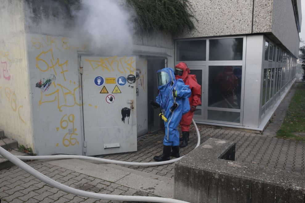 Um der Bevölkerung ein weiteres Einsatzspektrum der Feuerwehr näher zu bringen, wurde nach dem Brandeinsatz der Austritt von Chlorgas im Hallenbad gegenüber der Schule simuliert. Angenommen war ein Stoffaustritt durch eine Leckage an einer Flasche in der Chlorgasanlage. Hierzu wurden Komponenten des Umweltschutzzuges eingesetzt. Ein Trupp unter Chemikalienschutzanzug ging in den Gefahrenbereich zur Erkundung und Abdichtung der Leckage vor. Von außen wurde das Gas durch Kräfte der Jugendfeuerwehr niedergeschlagen. Dazu waren insgesamt 3 Fahrzeuge und 15 Kräfte eingesetzt.