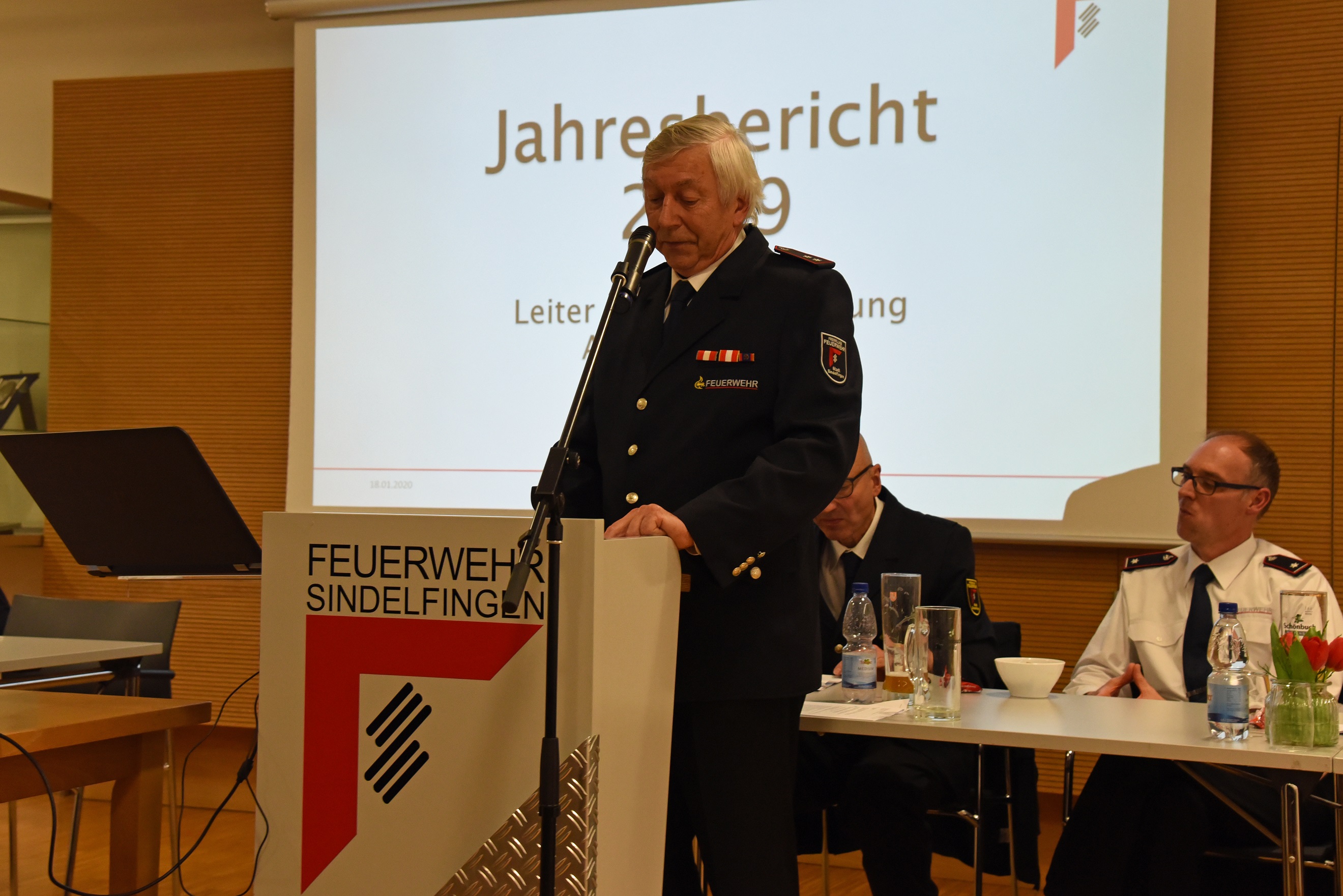 Im anschließenden Jahresbericht ließ Just das vergangene Jahr Revue passieren. Insgesamt musste die Abteilung Sindelfingen zu weniger Einsätzen als im Vorjahr ausrücken. Was daran lag, dass es keine größeren Sturm- und Starkregenereignisse wie im Jahr 2018 gab. Dennoch gab es 125 Brände, darunter 4 Großbrände. Einer davon bleibt besonders in Erinnerung, als in der Darmsheimer Porschestraße zwei Kameraden Ihren Einsatz fast mit ihrem Leben bezahlt hätten, als es zu einer Rauchgas-Durchzündung kam. Des Weiteren kamen Fehlalarme und Technische Hilfeleistungen, wie der tödliche Verkehrsunfall Ende November auf der B 464 dazu.