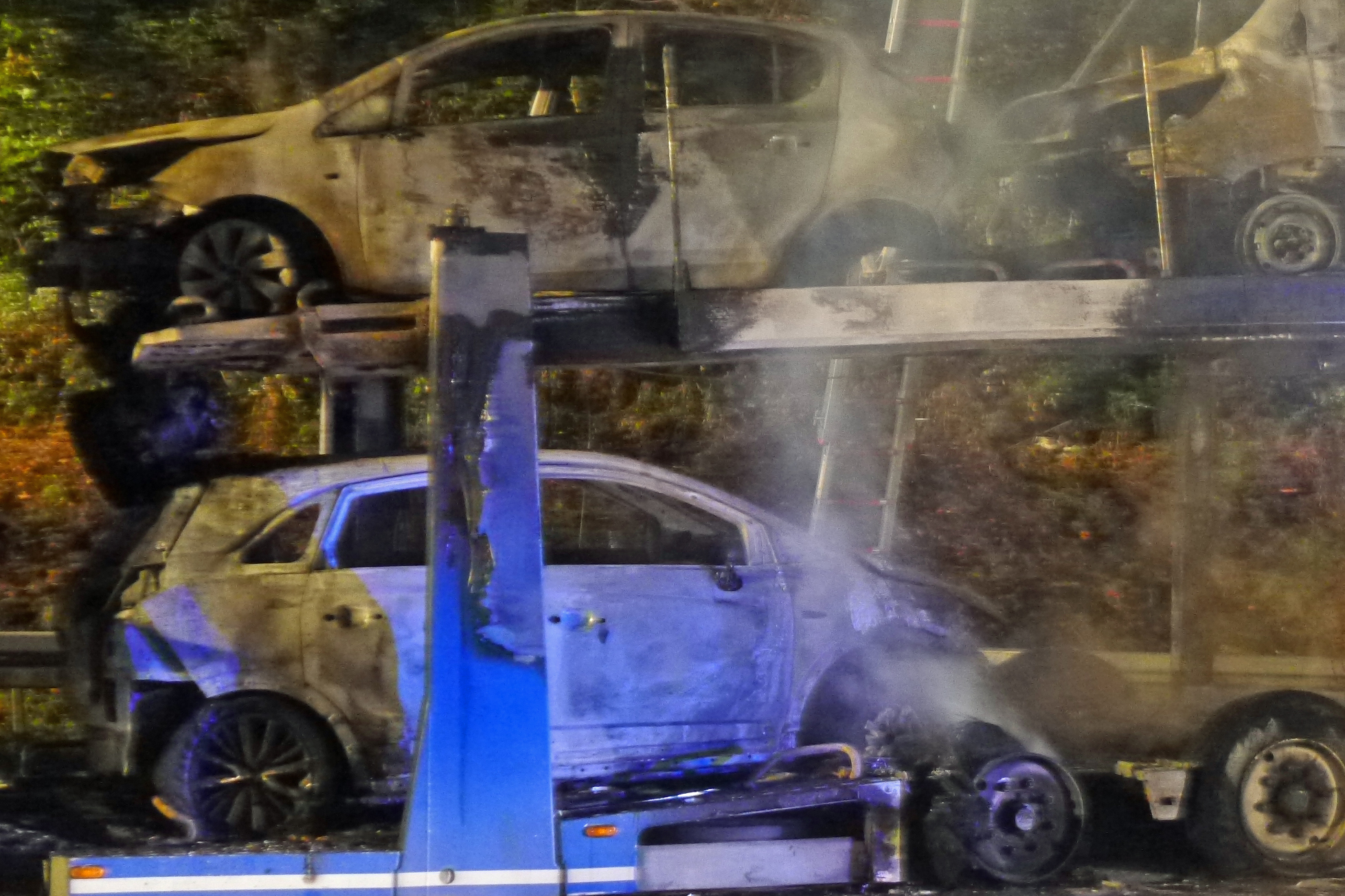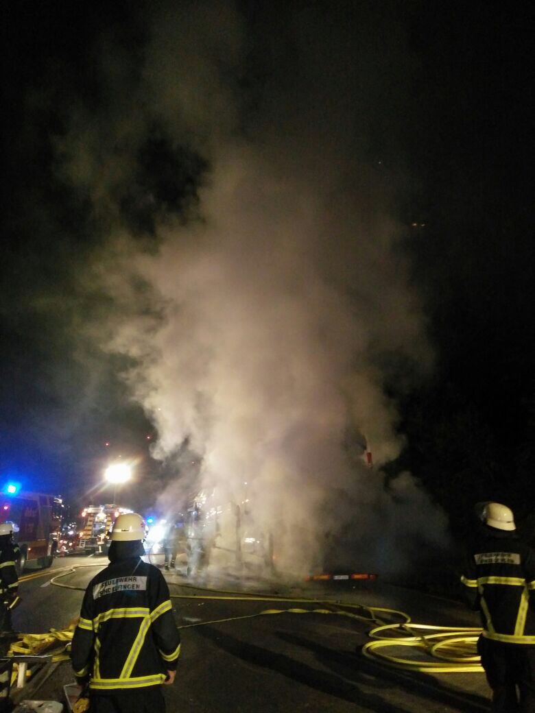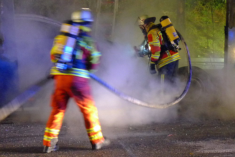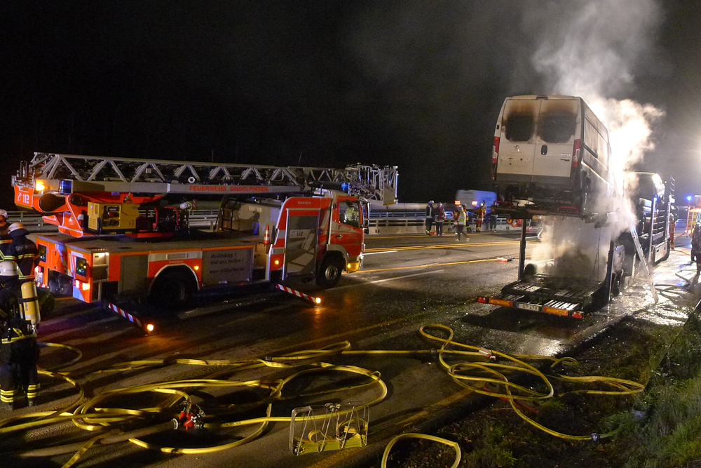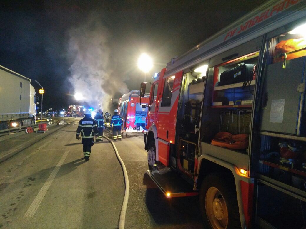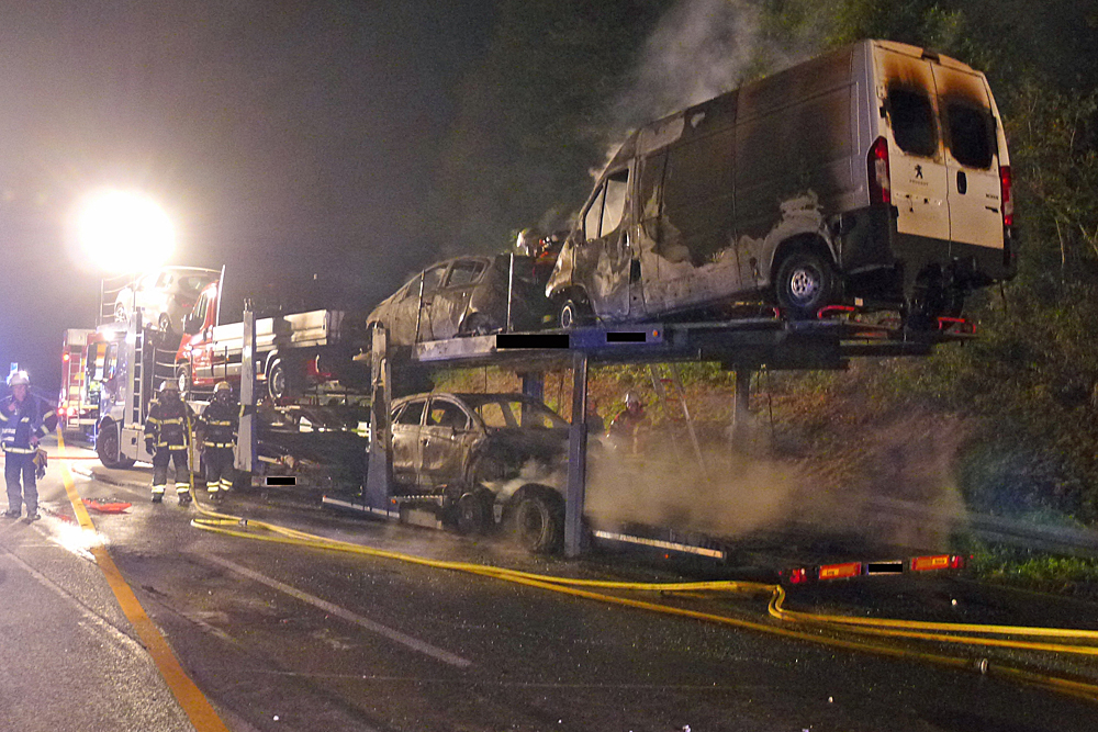 Die Feuerwehr Sindelfingen wurde am 4.10.17 um 20:47 Uhr zu einem brennenden Lkw-Reifen auf die A8 Fahrtrichtung Sindelfingen, kurz vor der Raststätte „Sindelfinger Wald“ alarmiert. Bereits auf der Anfahrt konnten die Einsatzkräfte erkennen, dass sich das Feuer bereits auf die Ladung des Autotransporters ausgebreitet hatte. Innerhalb weniger Minuten standen mehrere  PKW und Transporter, die der LKW geladen hatten, im Vollbrand. Durch das schnelle Handeln der Sindelfinger Einsatzkräfte konnte das Feuer auf den hinteren Teil des Autotransporters begrenzt werden. Zusätzlich wurde eine Drehleiter eingesetzt, um mehrere Fahrzeuge im oberen Deck des Fahrzeugtransporters abzulöschen.