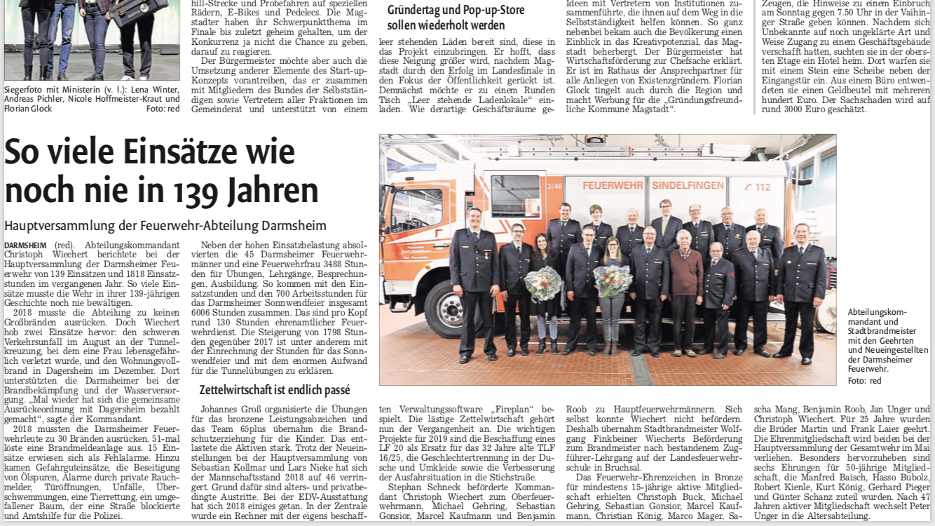 2018 musste die Darmsheimer Abteilung zu keinen Großbränden ausrücken. Allerdings erwähnte Wiechert zwei Einsätze: Den schweren Verkehrsunfall im August an der Tunnelkreuzung, bei dem eine Person lebensgefährlich verletzt wurde und schwerst eingeklemmt war. Nach einer guten Zeit konnte die Frau an den Rettungsdienst übergeben werden. Des weiteren der Wohnungsvollbrand in Dagersheim im Dezember. Dort unterstützten die Darmsheimer mit dem HLF bei der Brandbekämpfung und der Wasserversorgung der Böblinger Drehleiter. Mal wieder hat sich die gemeinsame Ausrückeordnung mit Dagersheim bezahlt gemacht.