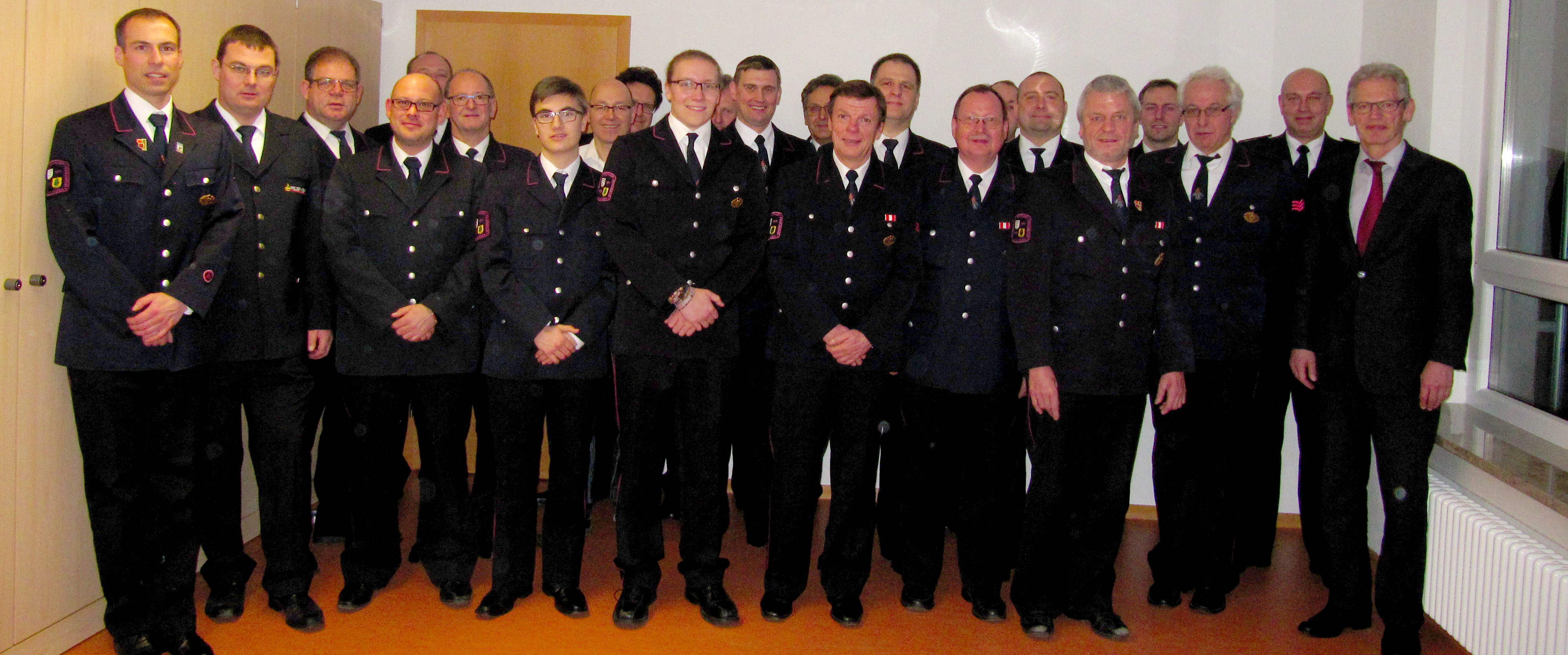 v.l.n.r. Pascal Sass, stellvertretender Abteilungskommandant Sascha Zagola, stellvertretender Stadtbrandmeister Bernd Holz, Alexander Döttling, Steffen Berner, Stadtbrandmeister Wolfang Finkbeiner, Marc Klotz, Jürgen Nordschild, Andreas Haug, André Haug, Uwe Hartmann, Michael Wacker, Walter Müller, Thomas Lamparter, Bernd Widmann, Joachim Hässner, Tobias Pfeiffer, Markus Hess, Willi Wieland, Michael Keppler, Walter Haug, Abteilungskommandant Sascha Luft, Ortsvorsteher Wolfang Leber