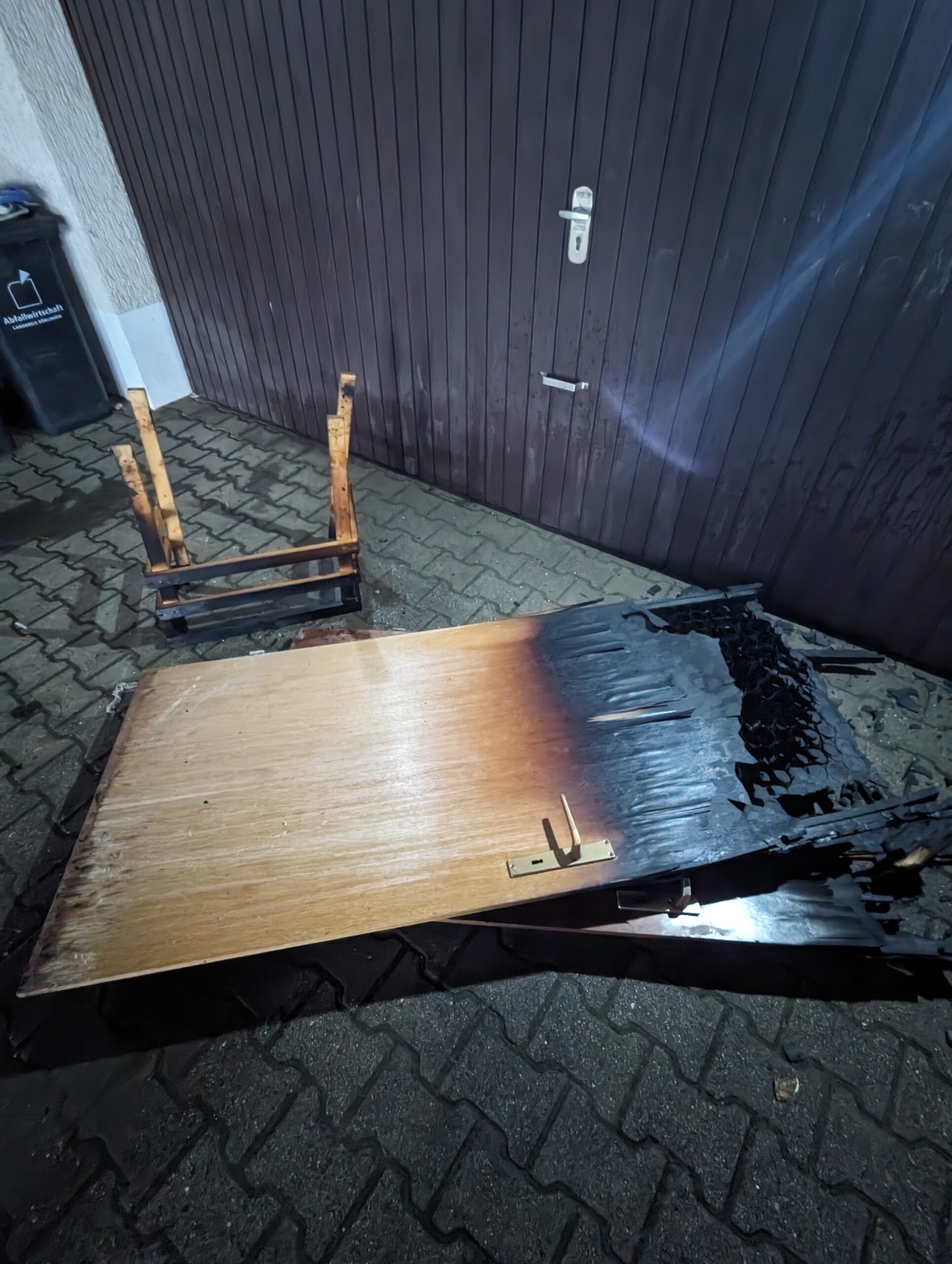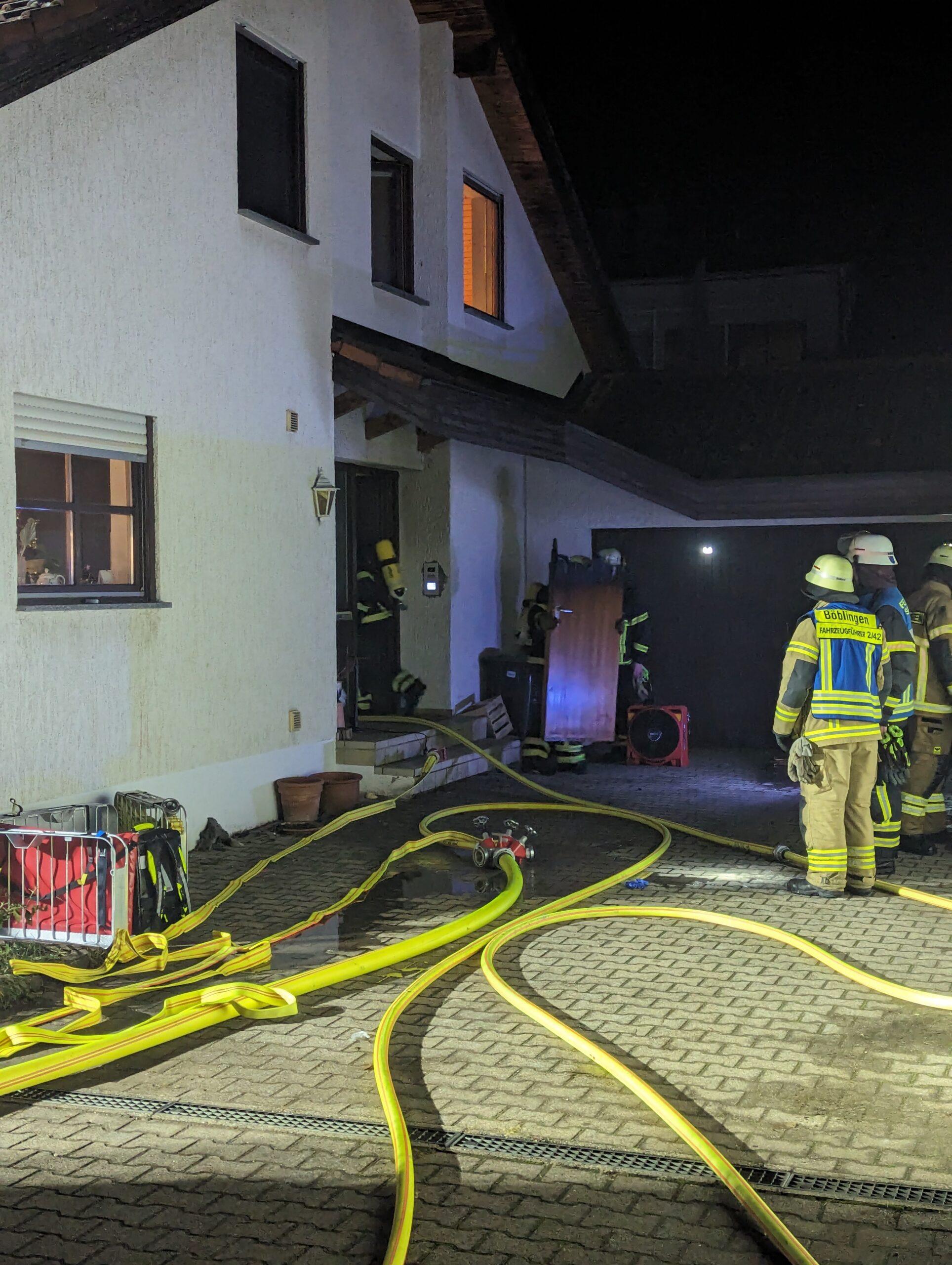 Noch auf der Anfahrt der Kräfte meldeten sich die Bewohner erneut telefonisch bei der Leistelle und meldeten, dass das Feuer wieder aufgeflammt sei. Vor Ort schlugen den Einsatzkräften dann bereits an der Kellertreppe Flammen aus dem Keller entgegen. Mit zwei Trupps unter Atemschutz wurde das Feuer bekämpft und gelöscht. Weitere Trupps kontrollierten das übrige Gebäude. Im Anschluss wurde das gesamte Gebäude belüftet und der Brandgut aus dem Keller ausgeräumt, um auch letzte Glutnester ablöschen zu können.