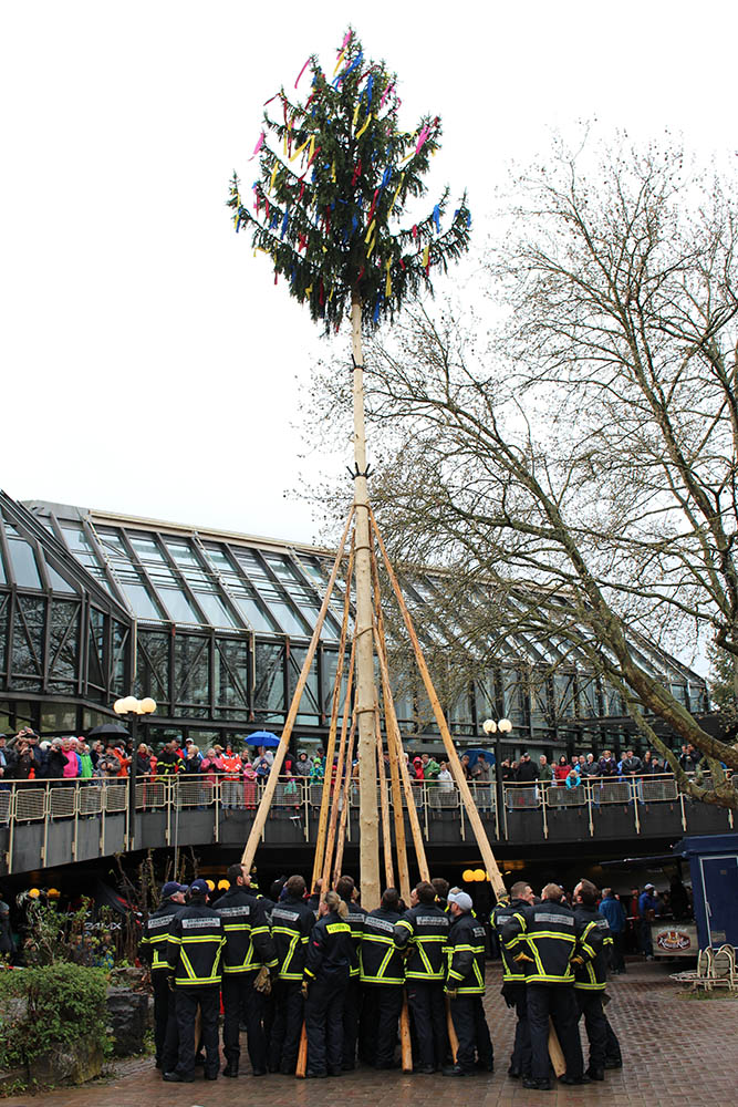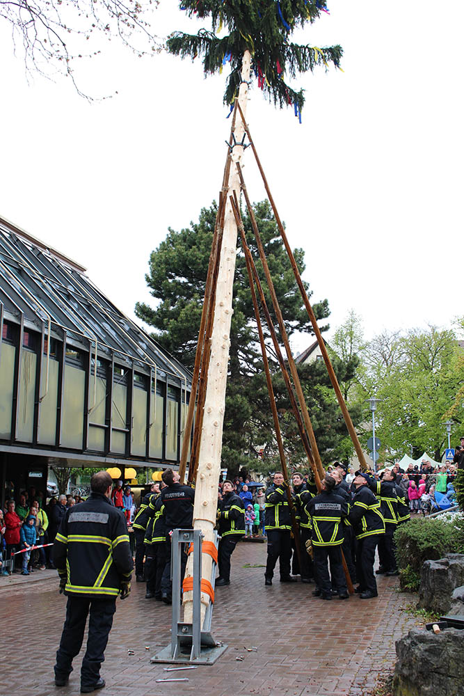 Am 1. Mai morgens um halb elf ließ es sich der Reit- und Fahrverein mit seinem Vorsitzenden Walter Arnold auch in diesem Jahr nicht nehmen, den Baum mit einem Pferdefuhrwerk und begleitet von Musik zum Bürgerhausvorplatz zu bringen, wo trotzt des schlechten Wetters zahlreiche Zuschauer gespannt auf das Maibaumstellen warteten. Dieser wurde zunächst im Metall-Schuh am Boden fest verankert. Eine Vorrichtung, die das seitliche Wegrutschen des Baumes beim Stellen verhindert. Sicherheit ist hier oberstes Gebot. Traditionell wird der Maichinger Baum noch ganz traditionell gestellt: Mit Muskelkraft und hölzernen “Schwalben”. Nico Haug hatte das Geschehen jederzeit unter Kontrolle, gab Hub um Hub seine Kommandos und so wurde bereits nach 20 Minuten der Baum in die Senkrechte gebracht. Unter dem Applaus der Zuschauer war das diesjährige Maifest der Musikkapelle Maichingen damit eröffnet.