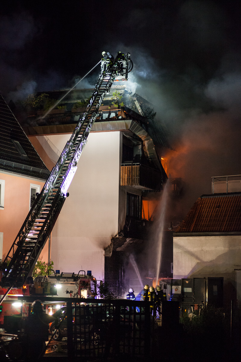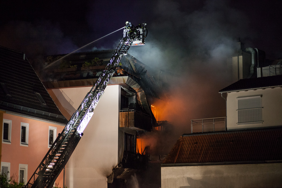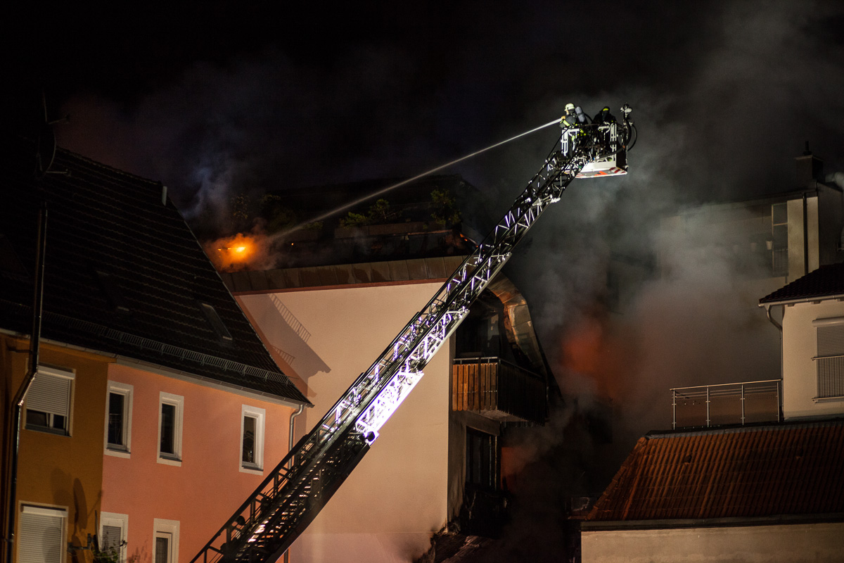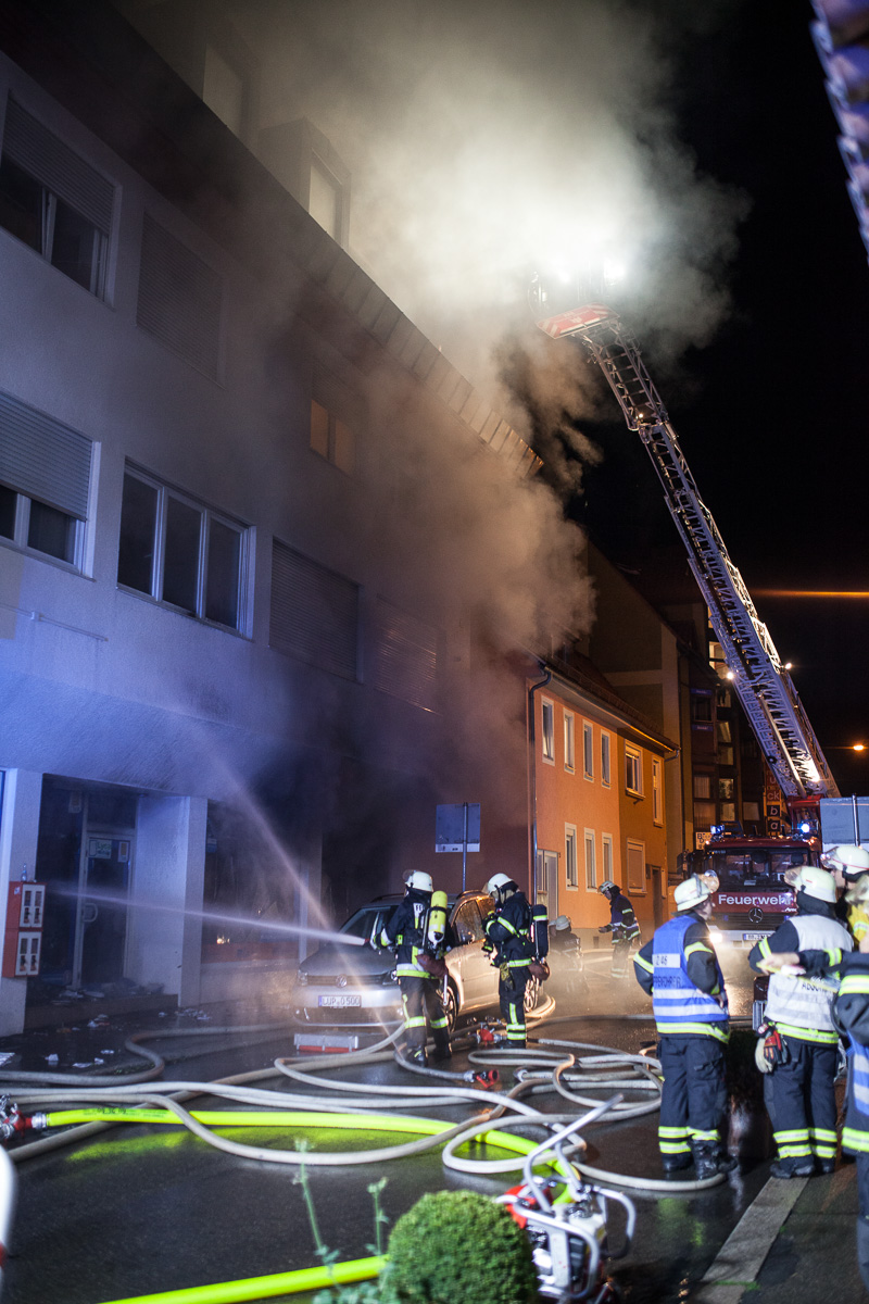 Am Montag, 20.7., wurde die Sindelfinger Feuerwehr um 1.13 Uhr zu einem Brand in der Grabenstraße alarmiert. Beim Eintreffen bot sich Einsatzleiter Rainer Just die Lage, dass auf der Rückseite des Gebäudes ein Brand ausgebrochen war, der bereits über die Fassade empor gestiegen und die oberen Etagen des Gebäudes erreicht hatte. Die Alarmstufe wurde darauf hin auf einen Brand der Stufe 3 eskaliert. Die massiv nachrückende Kräfte aus dem gesamten Landkreis wurden in drei Einsatzabschnitte aufgeteilt: Brandbekämpfung auf der Rückseite des Gebäudes, Innenangriff und Brandbekämpfung in den Wohnungen der Grabenstraße 3 sowie Schutz des angrenzenden Gebäudes. Zwei Drehleitern unterstützten die Löschmaßnahmen. Die große Hitze und die starke Rauchentwicklung stellten eine große Herausforderung dar, ebenso die räumliche Enge, auf der viele Einsatzfahrzeuge und Kräfte konzentriert arbeiten mussten. Der Brand in den Wohnungen konnte durch den hohen Kräfteeinsatz nach ca. einer Stunde unter Kontrolle gebracht werden. Zur Herausforderung wurde im Anschluss der Dachstuhlbrand. Dieser drohte auf das angrenzende Gebäude überzugreifen. Um die Löschmaßnahmen nochmals zu verbessern, wurde durch die Einsatzleitung der Teleskopmast der Werkfeuerwehr Mercedes Benz angefordert. Problematisch bei Dachstuhlbränden ist, dass die Löschwirkung des Wassers erst eintritt, wenn es auch an den Brandherd gelangt. Dafür muss jedoch die Dachhaut geöffnet werden, was mit technischem Gerät vorangetrieben wurde. Die Löscharbeiten sind auch am Mogren noch im Gange.