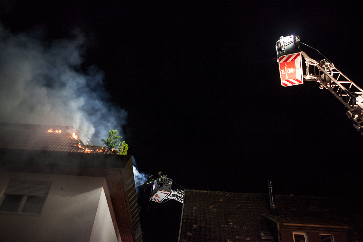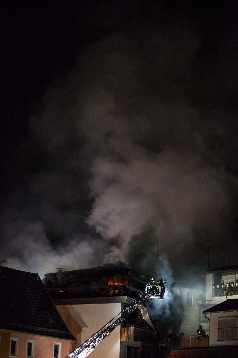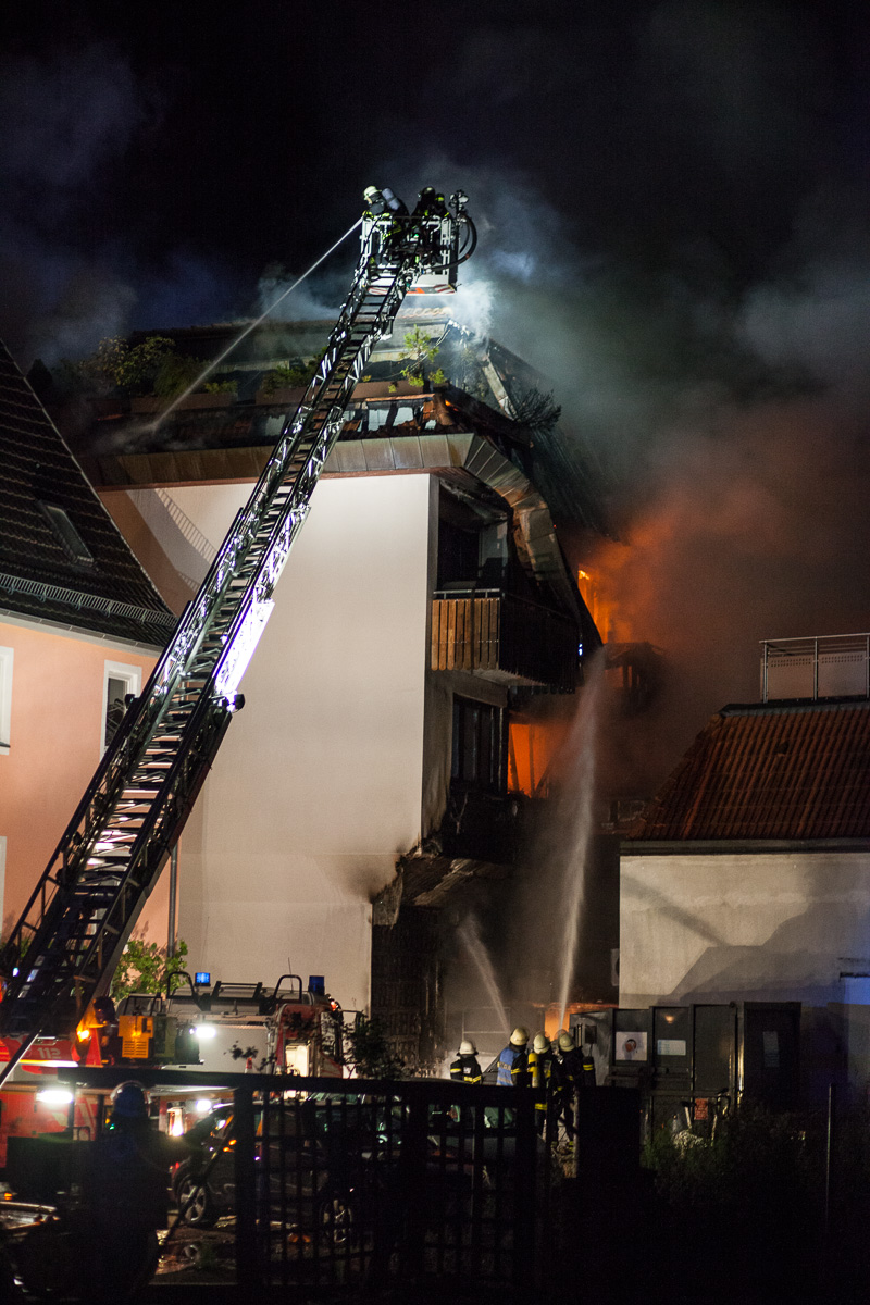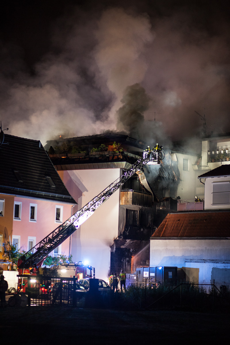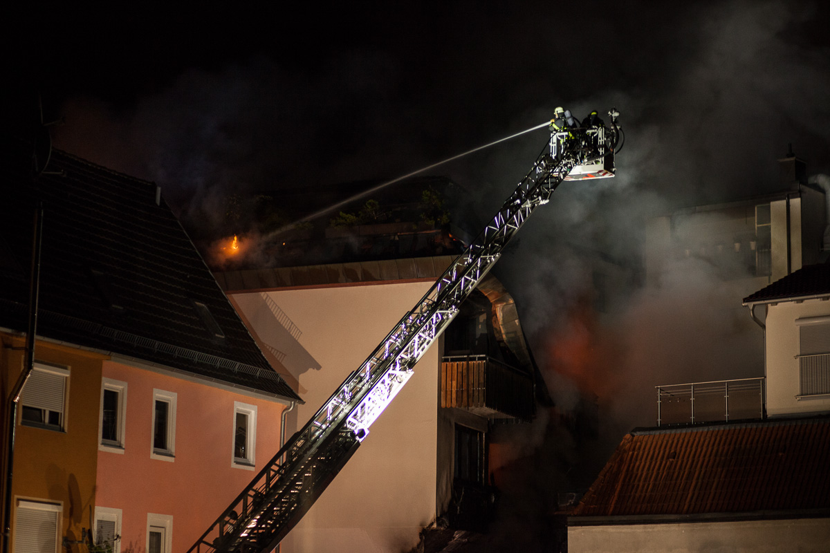 Am Montag, 20.7., wurde die Sindelfinger Feuerwehr um 1.13 Uhr zu einem Brand in der Grabenstraße alarmiert. Beim Eintreffen bot sich Einsatzleiter Rainer Just die Lage, dass auf der Rückseite des Gebäudes ein Brand ausgebrochen war, der bereits über die Fassade empor gestiegen und die oberen Etagen des Gebäudes erreicht hatte. Die Alarmstufe wurde darauf hin auf einen Brand der Stufe 3 eskaliert. Die massiv nachrückende Kräfte aus dem gesamten Landkreis wurden in drei Einsatzabschnitte aufgeteilt: Brandbekämpfung auf der Rückseite des Gebäudes, Innenangriff und Brandbekämpfung in den Wohnungen der Grabenstraße 3 sowie Schutz des angrenzenden Gebäudes. Zwei Drehleitern unterstützten die Löschmaßnahmen. Die große Hitze und die starke Rauchentwicklung stellten eine große Herausforderung dar, ebenso die räumliche Enge, auf der viele Einsatzfahrzeuge und Kräfte konzentriert arbeiten mussten. Der Brand in den Wohnungen konnte durch den hohen Kräfteeinsatz nach ca. einer Stunde unter Kontrolle gebracht werden. Zur Herausforderung wurde im Anschluss der Dachstuhlbrand. Dieser drohte auf das angrenzende Gebäude überzugreifen. Um die Löschmaßnahmen nochmals zu verbessern, wurde durch die Einsatzleitung der Teleskopmast der Werkfeuerwehr Mercedes Benz angefordert. Problematisch bei Dachstuhlbränden ist, dass die Löschwirkung des Wassers erst eintritt, wenn es auch an den Brandherd gelangt. Dafür muss jedoch die Dachhaut geöffnet werden, was mit technischem Gerät vorangetrieben wurde. Die Löscharbeiten sind auch am Mogren noch im Gange.