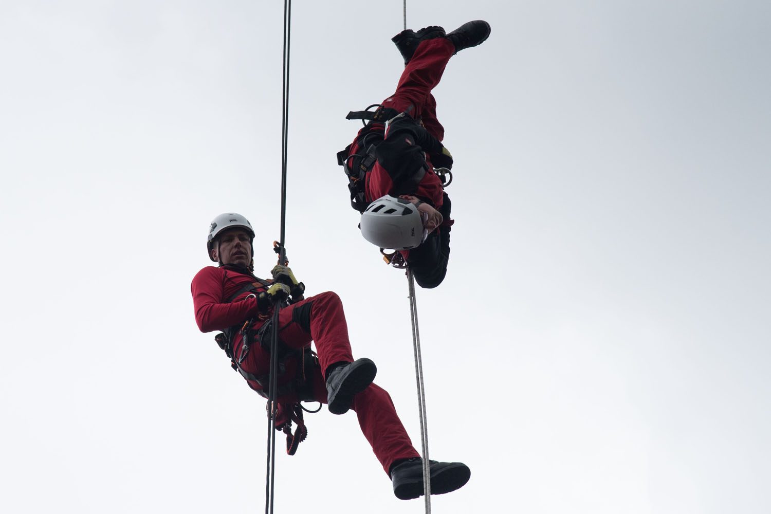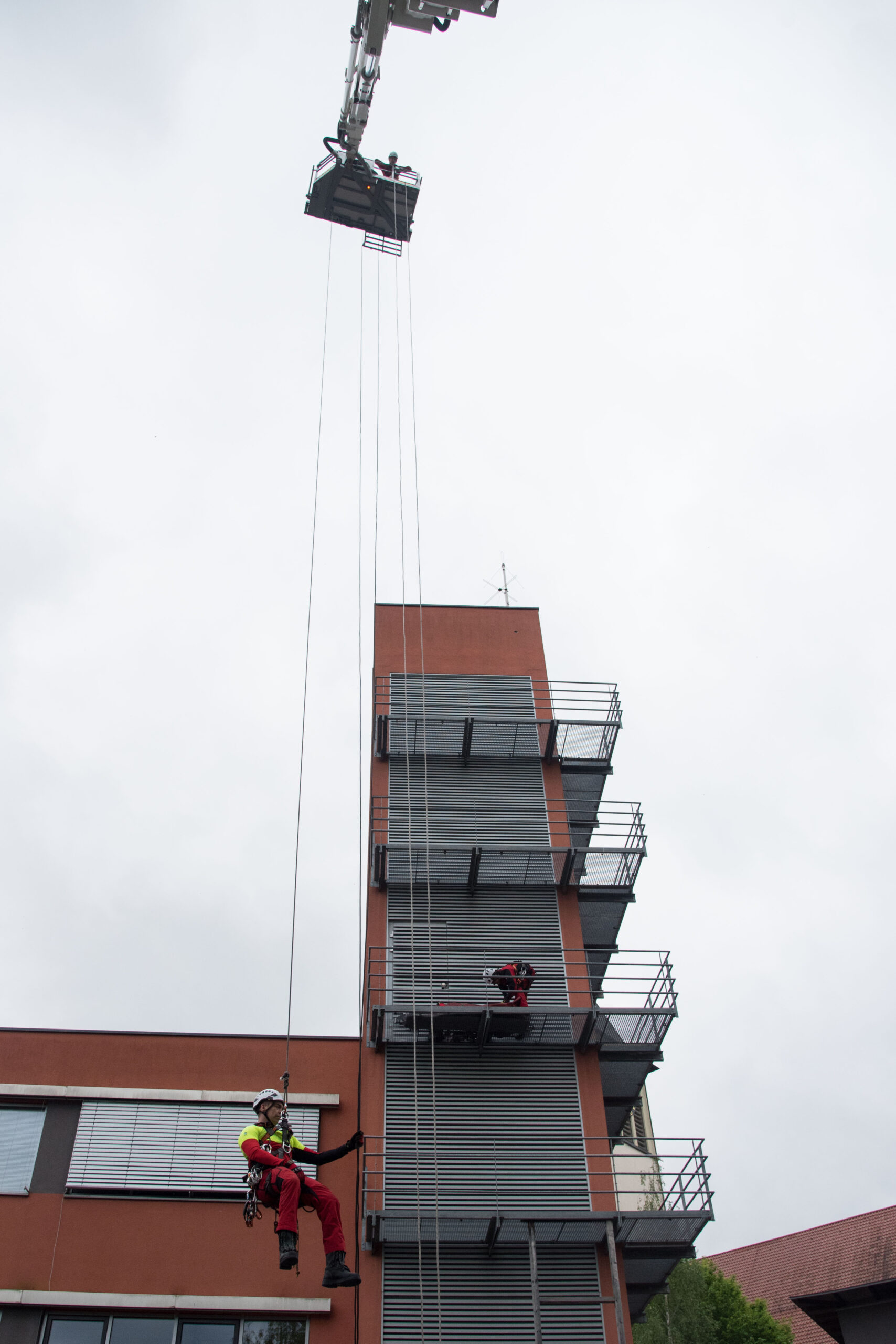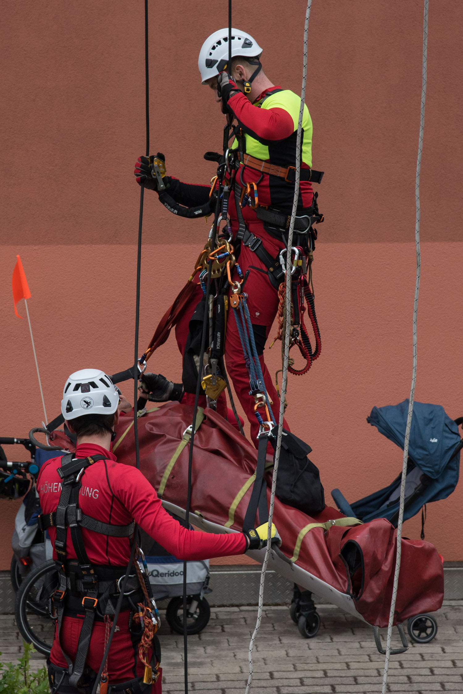 Ein Highlight war die Vorführung der Höhenretter der Werkfeuerwehr Mercedes-Benz. Die Kameraden zeigten den Besuchern unterschiedliche Möglichkeiten des Abfahrens am Seil, das Retten von Personen mit einer Trage, sowie die Technik des Seilschneidens.