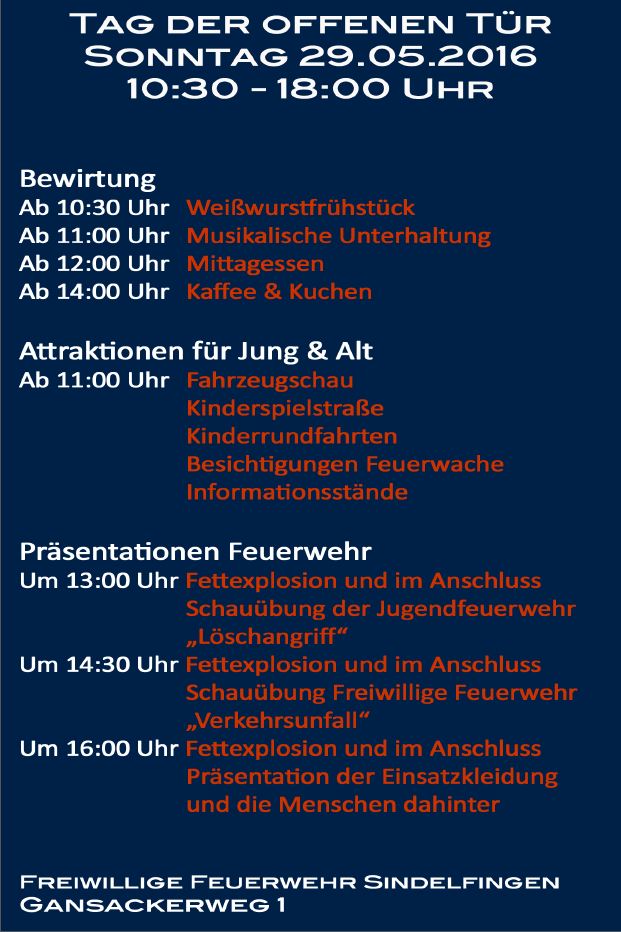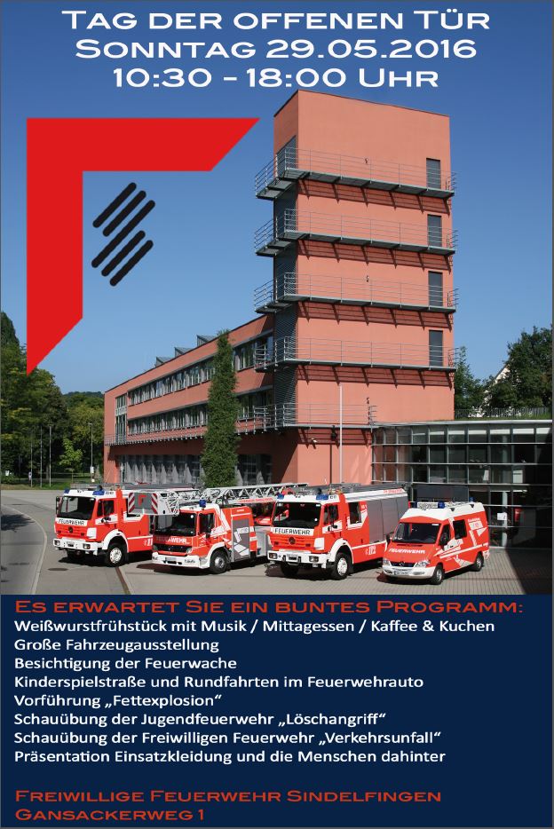 Die Freiwillige Feuerwehr Sindelfingen lädt Sie am 29.05.2016 von 10:30 Uhr bis 18:00 zu einem großen Tag der offenen Tür in die Sindelfinger Feuerwache ein.