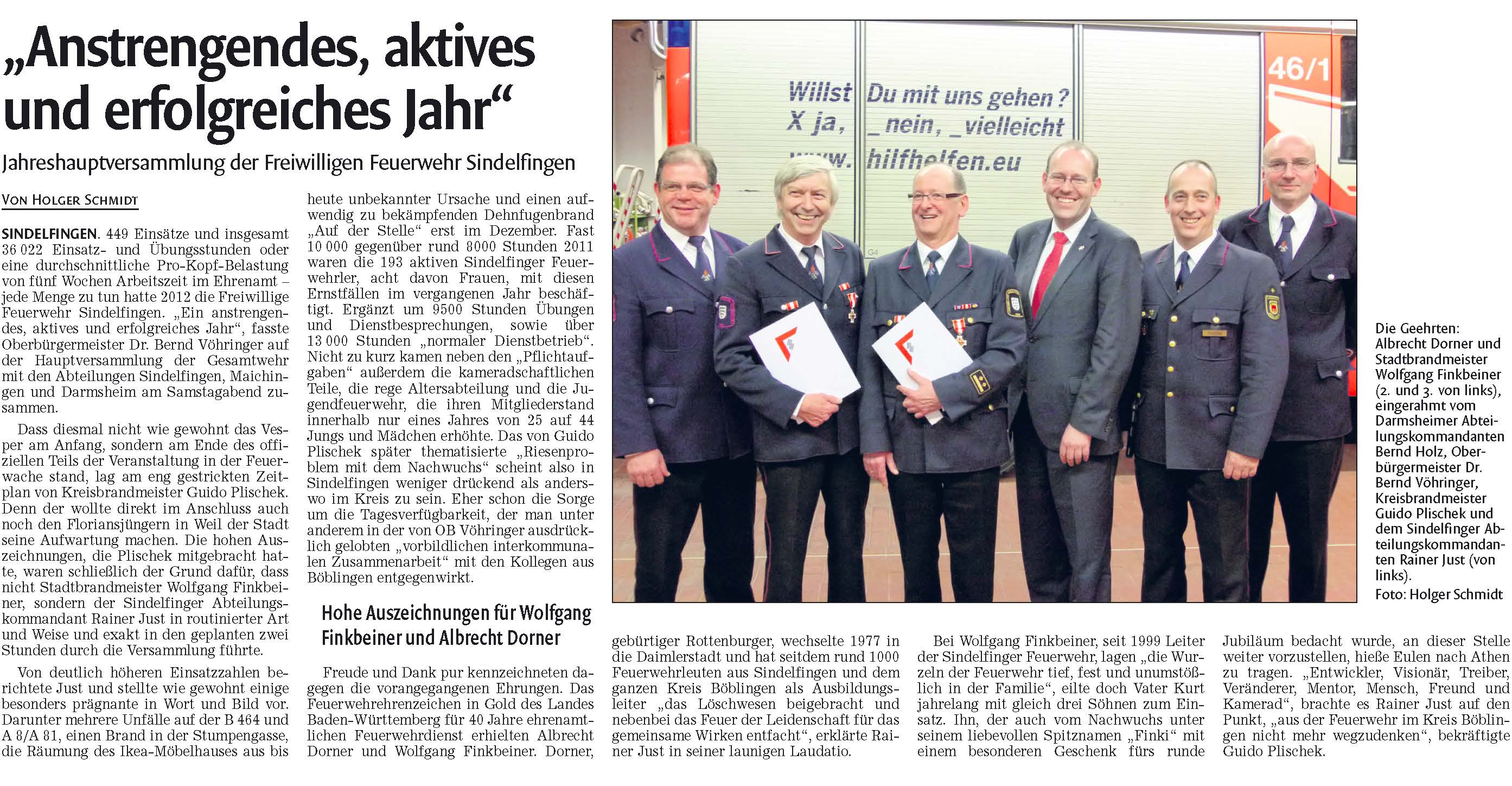 Mit einer beachtlichen Leistungsbilanz ließ Sindelfingens stv. Stadtbrandmeister und Abteilungskomandant Rainer Just bei der Hauptversammlung der Gesamtwehr das Jahr 2012 Revue passieren.