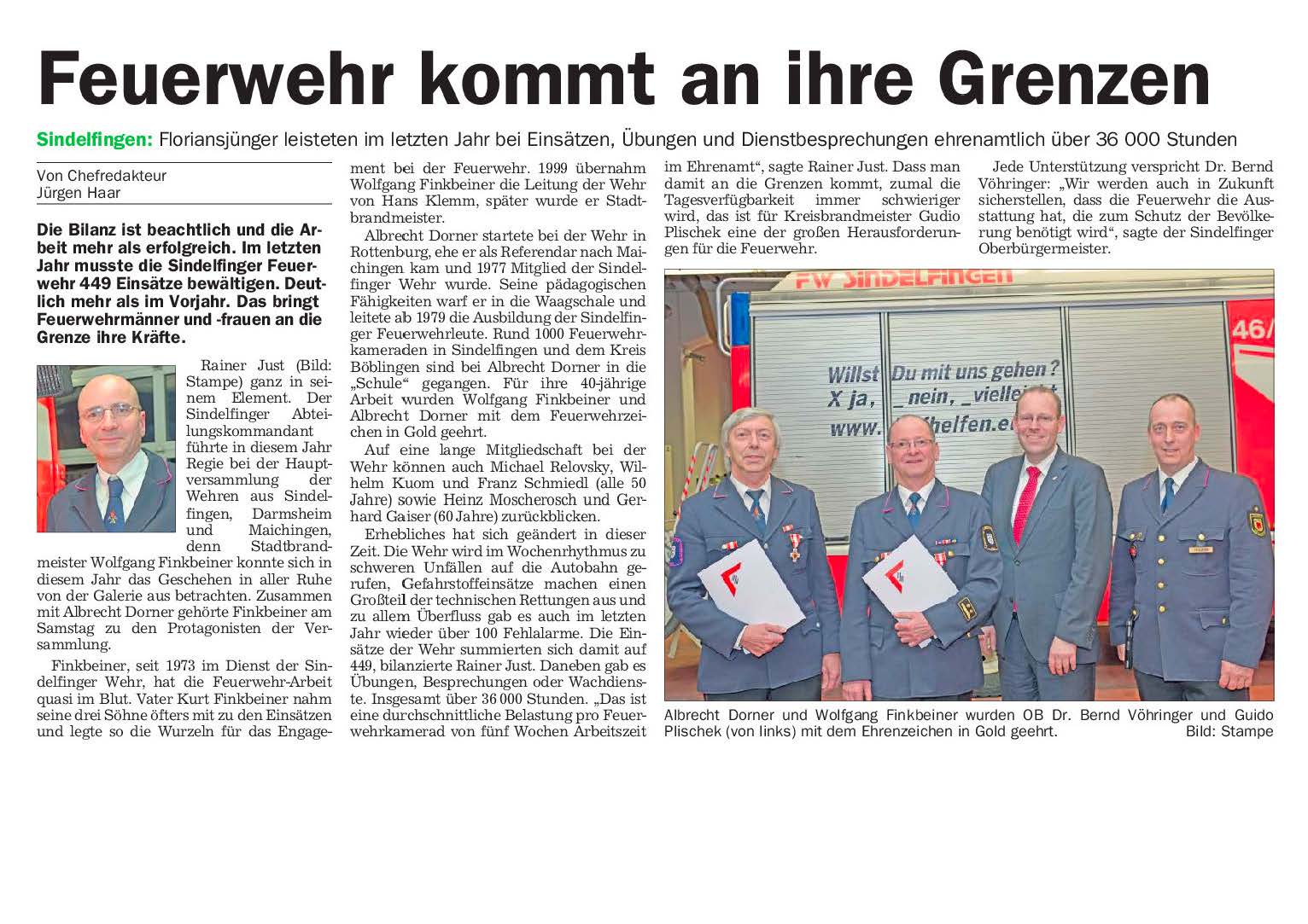 Dass in diesem Jahr nicht Wolfgang Finkbeiner sondern Rainer Just die Versammlung der drei Abteilungen Sindelfingen, Maichingen und Darmsheim leitete, hat einen schönen Grund: Finkbeiner konnte sich in diesem Jahr zurücklehnen und als Jubilar das Geschehen in aller Ruhe betrachten. Zusammen mit Albrecht Dorner wurde er für 40 Jahre Feuerwehrzugehörigkeit geehrt und ausgezeichnet.