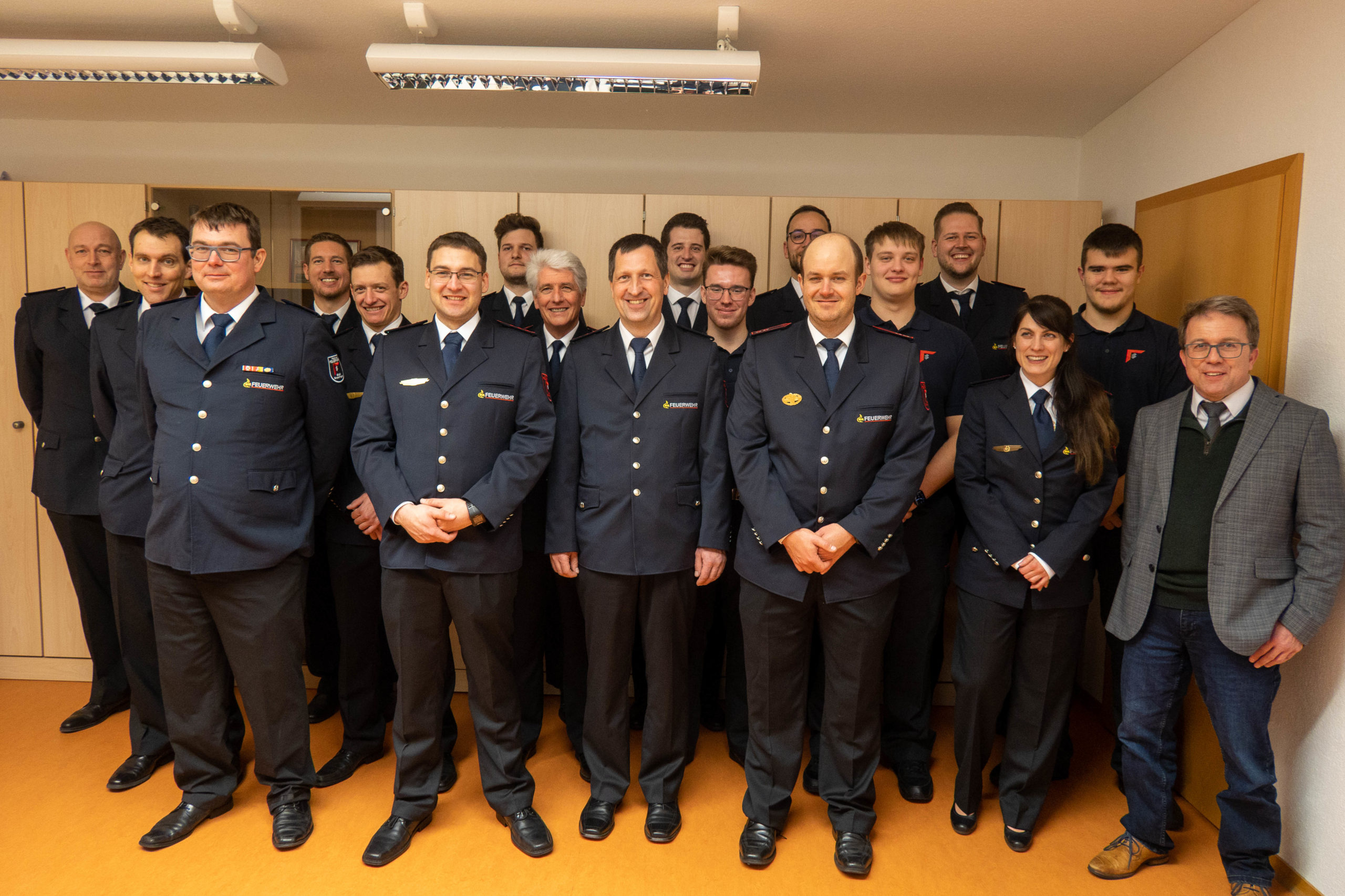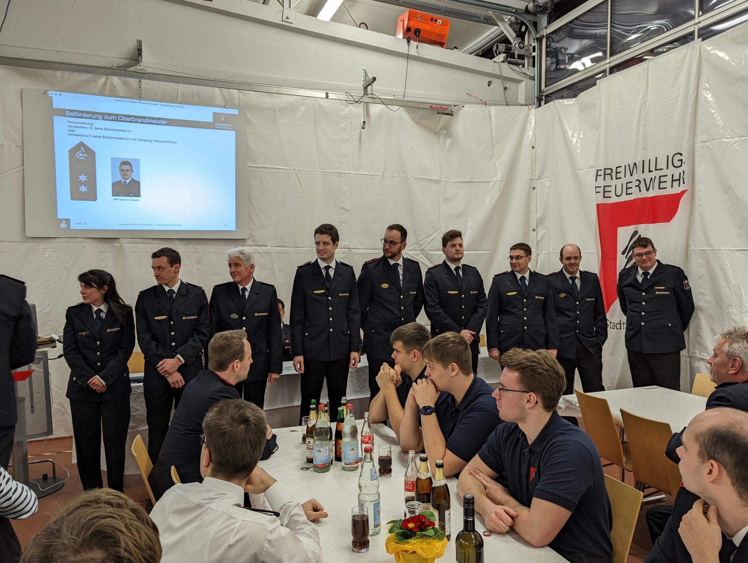 Unter dem Tagesordnungspunkt Beförderungen wurden Jessica Henoch zur Oberfeuerwehrfrau sowie Armin Bruhn, Lars Hartmann, Pascal Haug, Raphael Koch und Marc Sauermann zu Hauptfeuerwehrmännern befördert. Nico Haug wurde nach bestandenem Lehrgang zum Löschmeister ernannt und für die Dauer von zwei Jahren zum Gruppenführer bestellt. Zum Brandmeister befördert und als Zugführer bestellt, ebenfalls für zwei Jahre, wurde Tobias Pfeiffer. Sascha Zagola wurde in den Rang des Oberbrandmeisters erhoben, nachdem auch er den notwendigen Lehrgang bereits 2021 absolviert hatte.
