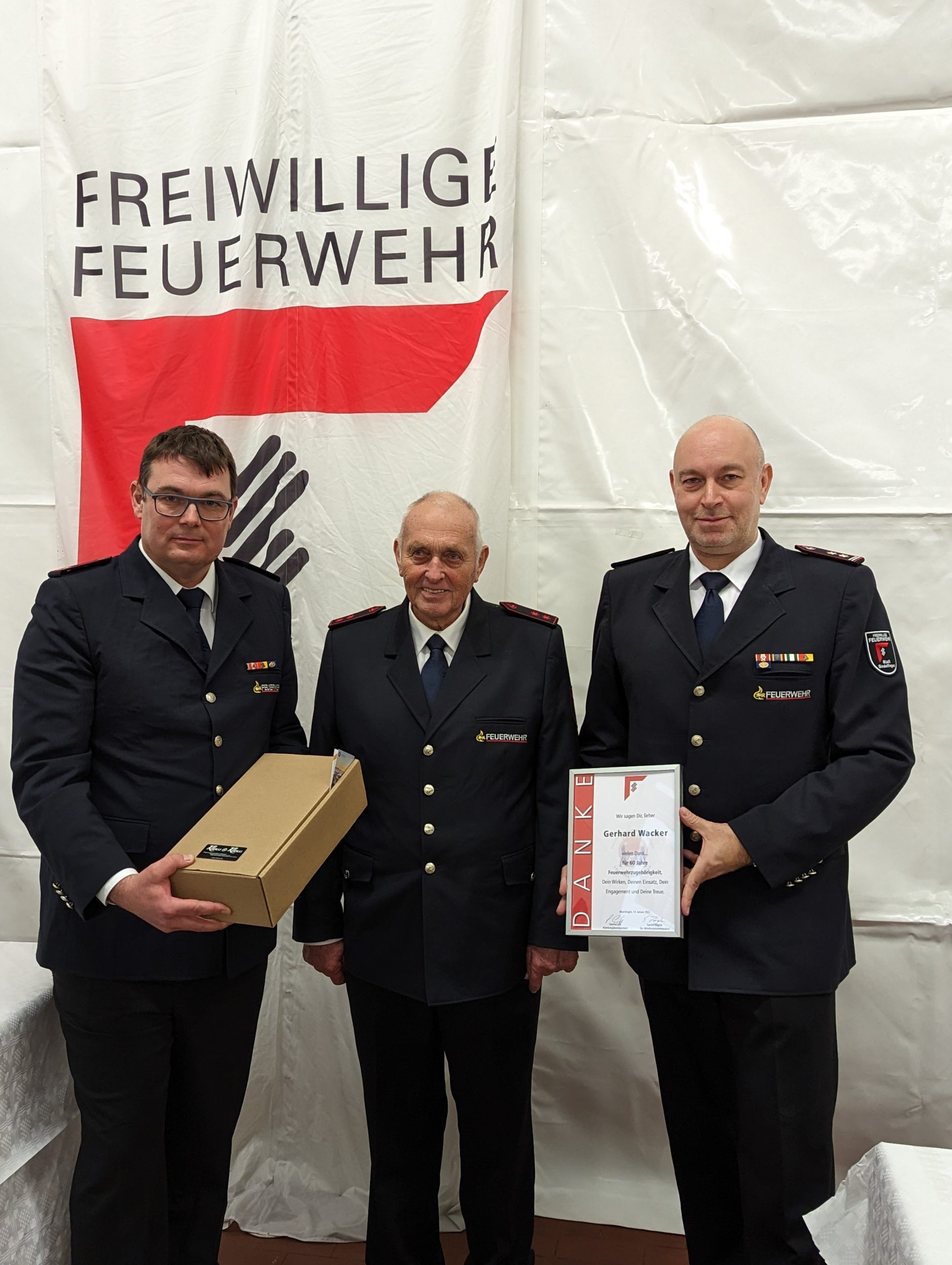 Es gab noch zwei weitere besondere Ehrungen: Ehrenkommandant Eugen Schöffler und Gerhard Wacker sind im Jahr 1963 in die damals noch selbstständige Maichinger Feuerwehr eingetreten und damit seit großartigen 60 Jahren Mitglied in der Feuerwehr. Aus dem aktiven Dienst verabschiedet wurde Rainer Köberling. Er wechselt nach 43 Jahren in die Altersabteilung.