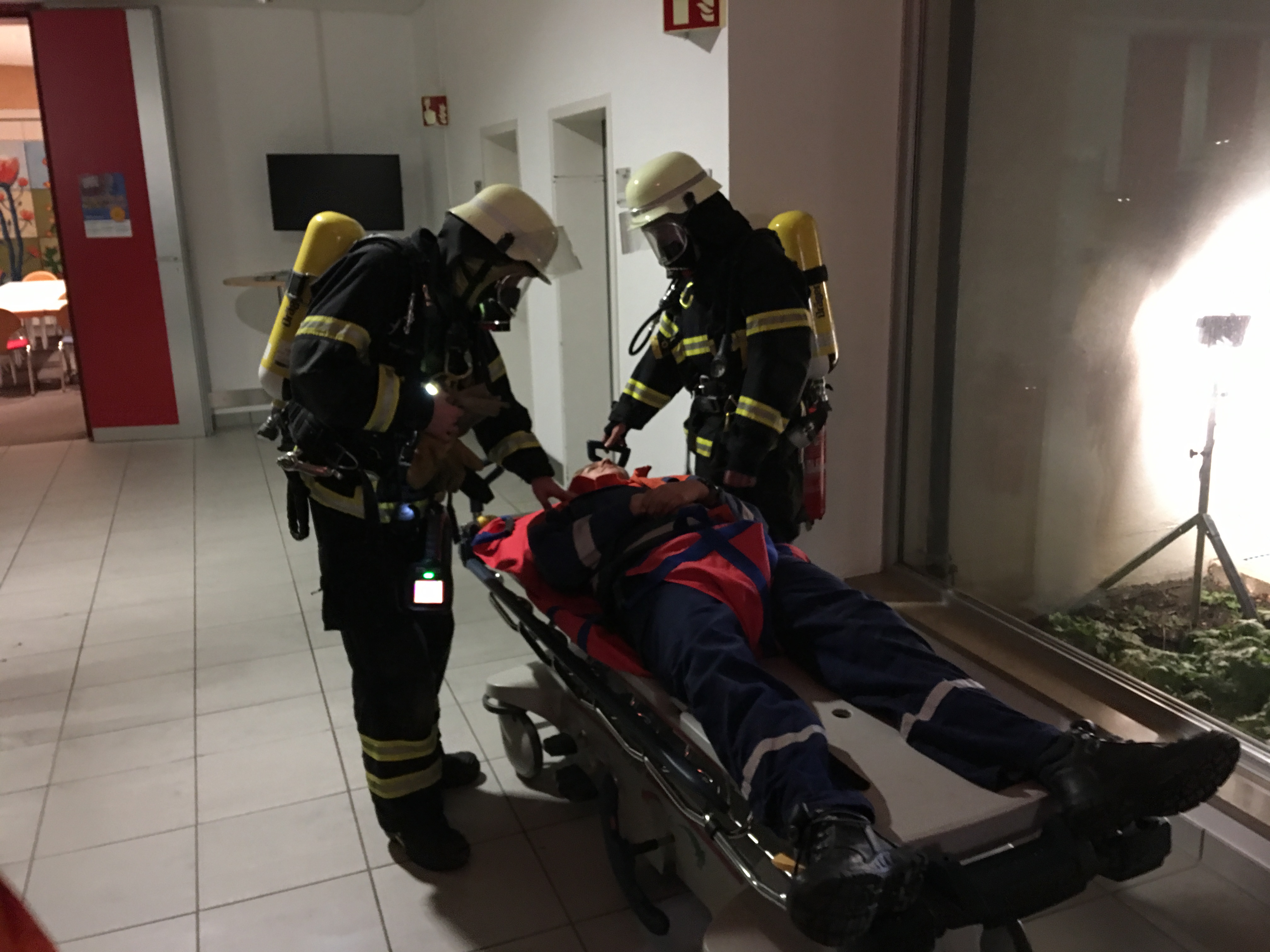 Mehrere Trupps unter Atemschutz gehen sofort vor, um die Patienten zu retten und um das Feuer zu bekämpfen. Die Rettung wird insoweit erschwert, dass einige „Patienten“, dargestellt durch die Jugendfeuerwehr, nicht gehfähig sind und teilweise an lebenswichtigen Maschinen hängen. Um auch diese Patienten möglichst schonend zu retten, kommt die Rettungsmatratze zum Einsatz. Mit dieser Matratze wird im gesamten Klinikverbund bereits gearbeitet. So können auch bettlägerige Patienten schnell aus dem Gefahrenbereich gebracht werden.